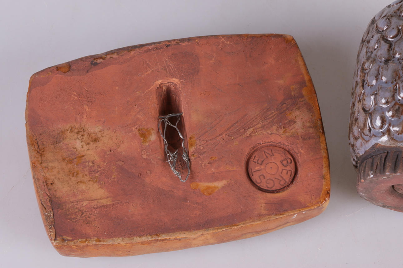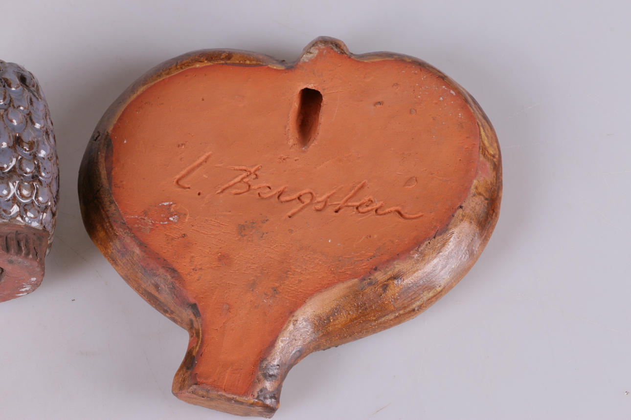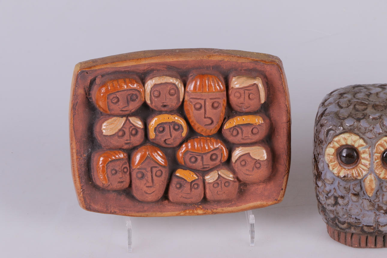 Figurer i keramik av Lars Bergsten Ansikte och familjeporträtt för upphängning, höjd 18 respektive 10 cm Uggla höjd 9 cm.