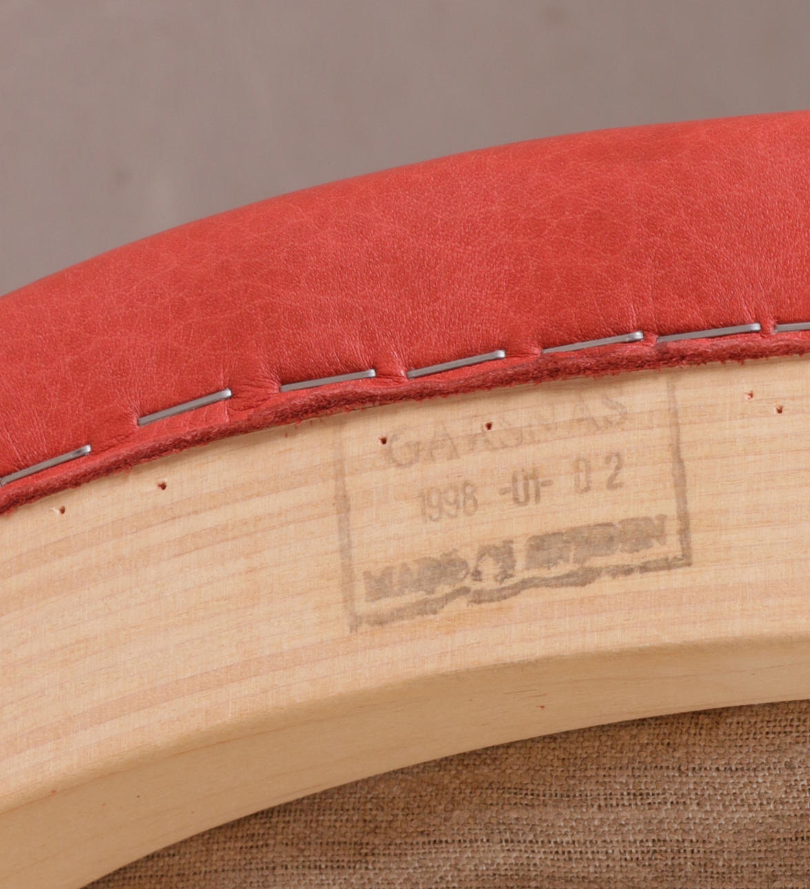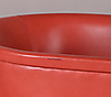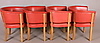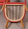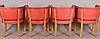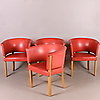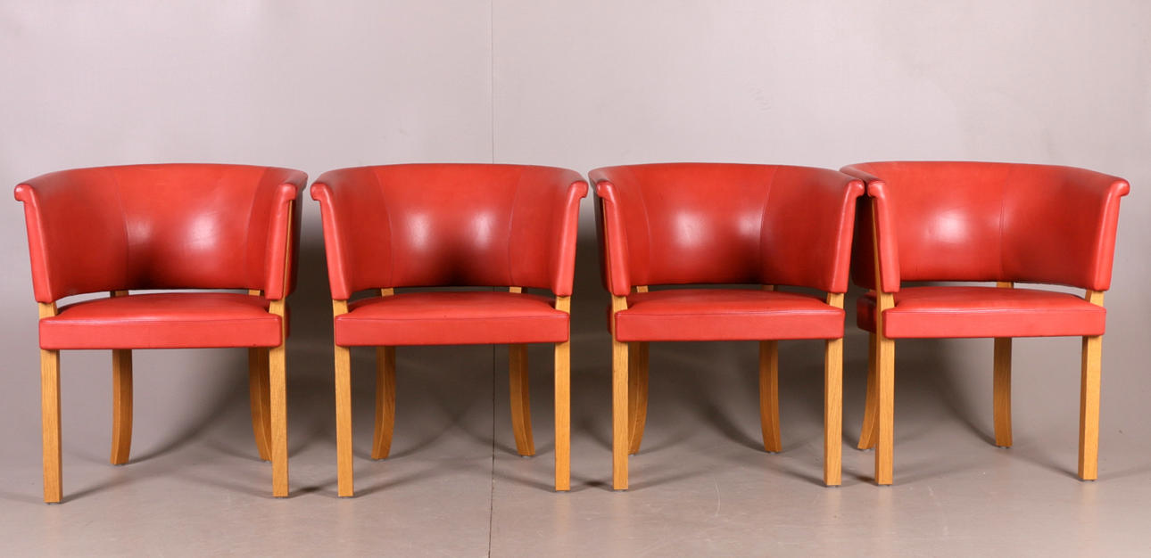 Karmstolar med stomme i ek, fast klädsel i rött skinn Ryggstödets höjd 76, sitthöjd 45, sittdjup 47, brett 63 cm.
