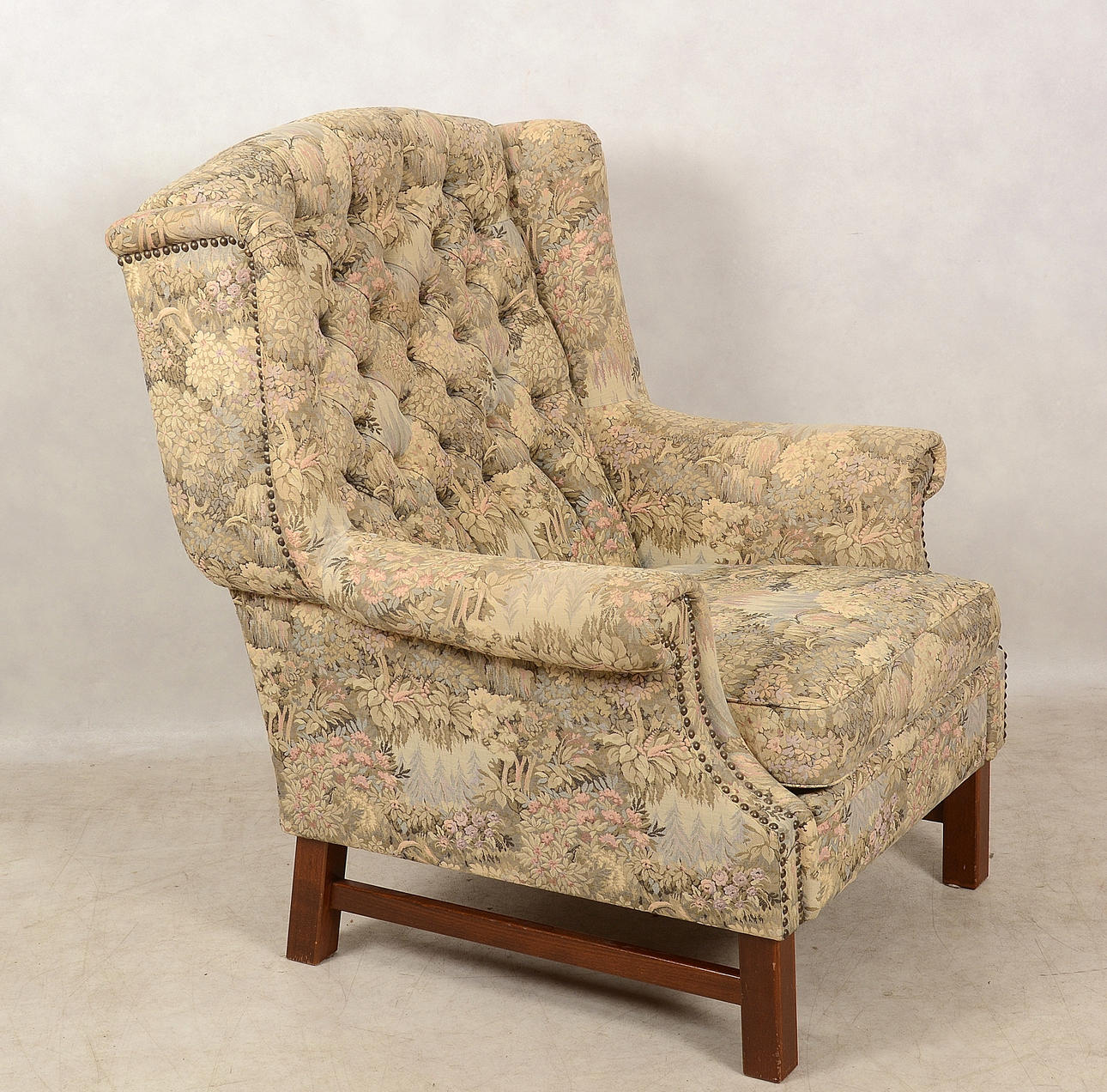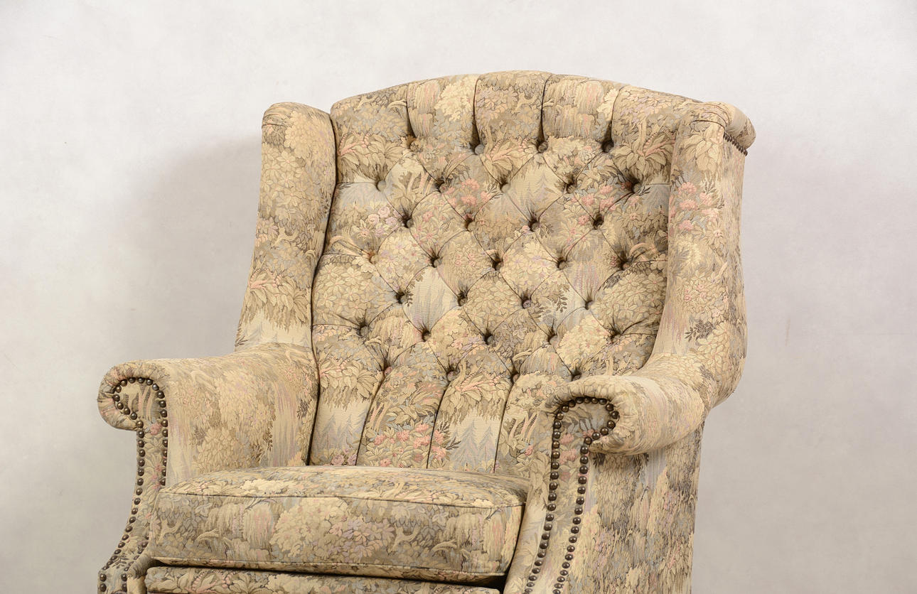 Blommig tygklädsel. Bredd 77 cm. Djup 70 cm. Rygghöjd 105 cm.