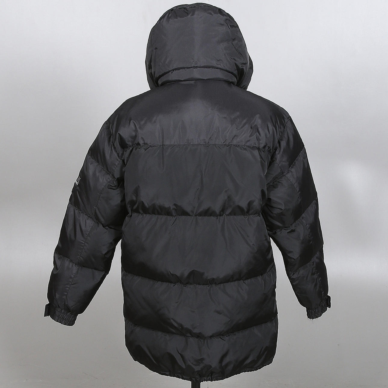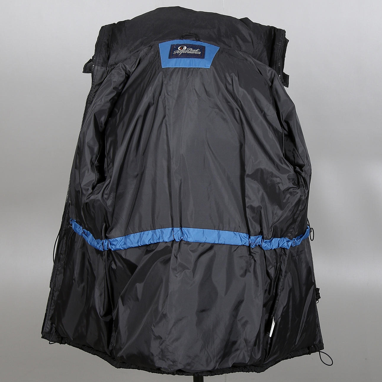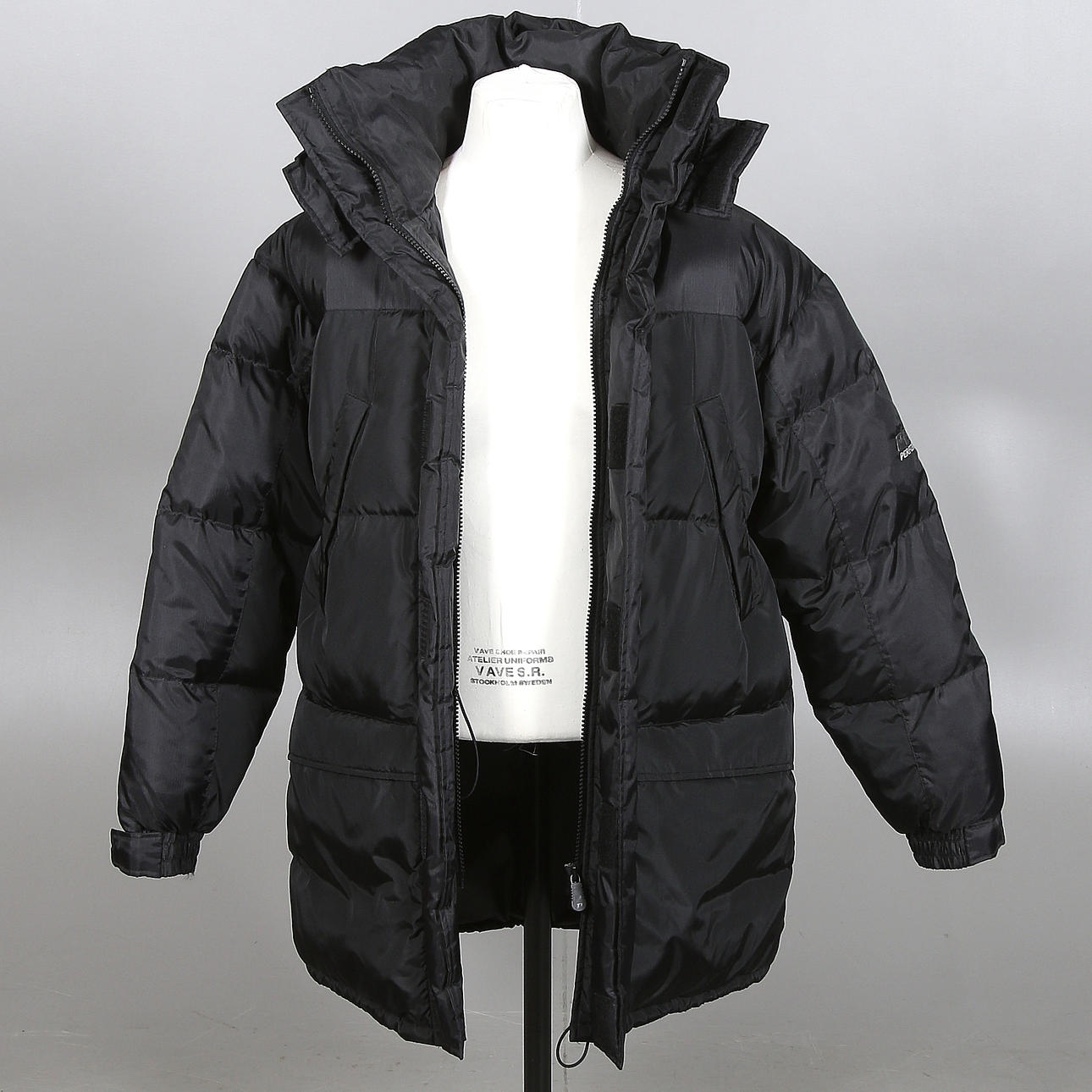 Rymlig herrmodell. Svart, avtagbar kapuschong med fleeecefoder. Stängning med dragkedja och kardborrband, fickor i sidan samt. Rygglängd 100 cm.