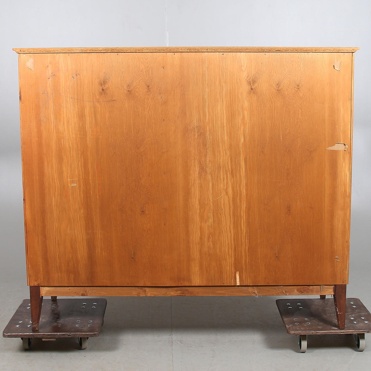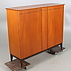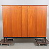 Teakfaner med tre dörrar med bakomliggande hyllplan och lådor, på benställning. Längd 133 cm, bredd 43 cm, höjd 113 cm.