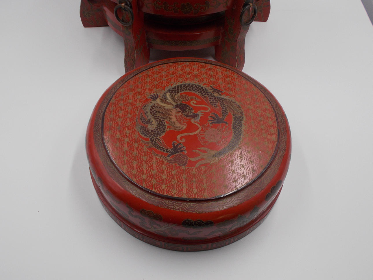 Bamburöd lack med svarta och gulddekorationer med drakmotiv och bronsdekorationer, total höjd ca 44 cm, bredd ca 32 cm, krukdiameter ca 25 cm, avtagbar med lock, Kina, 1800-tal.