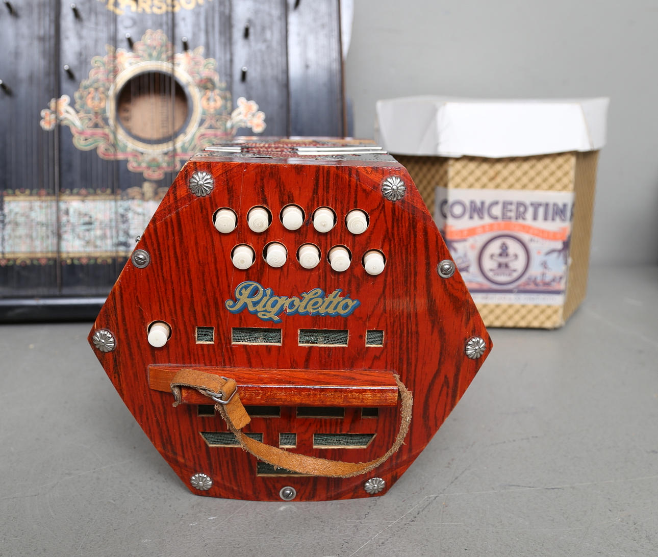Dragspel i box. barnmodell.
