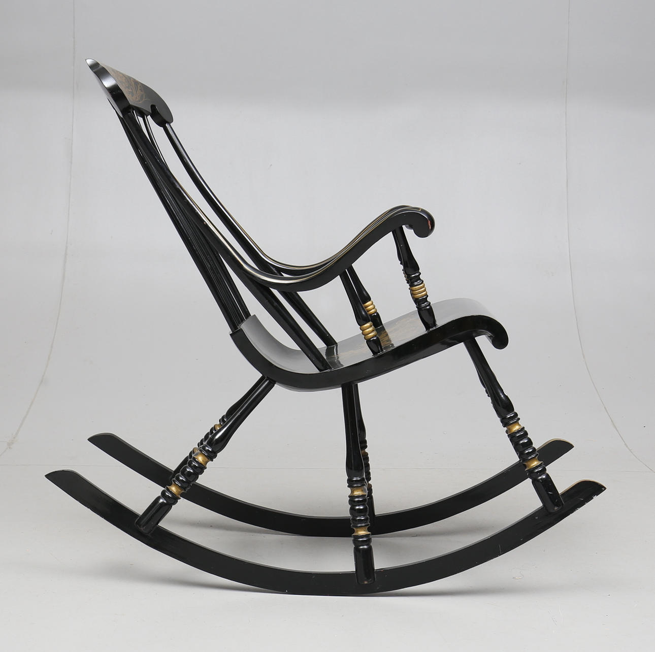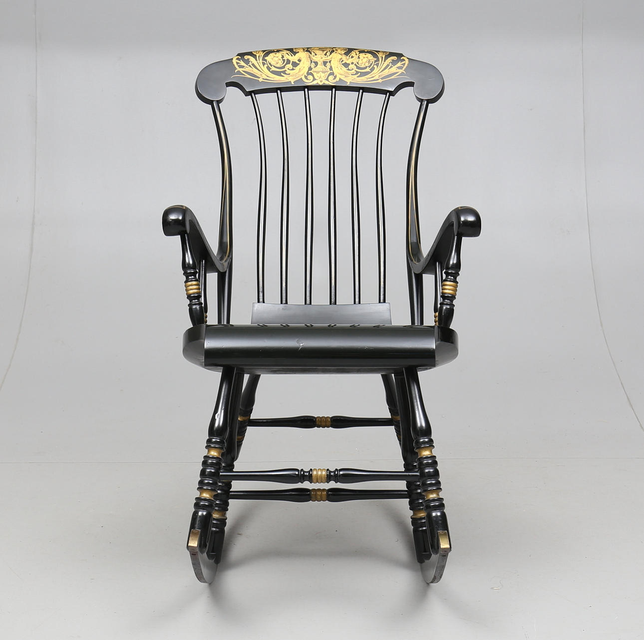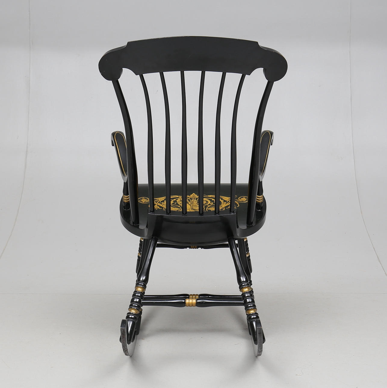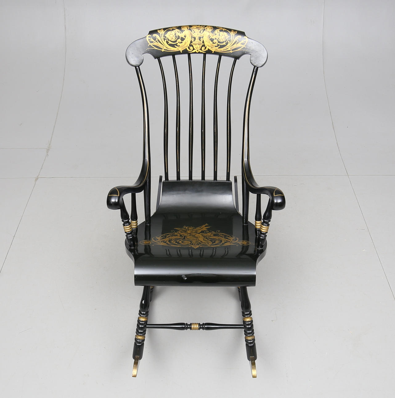 Målad och bronserad. Spjälad rygg. Höjd ca 114 cm.