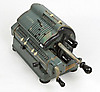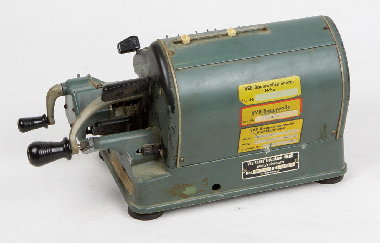 Metallmålad grön, utförande av en steghjulsberäkningsmaskin modell VII/16 *MELITTA*av VEB Ernst Thälmann Werke Suhl, som tog över produktionen av de tidigare Mercedes-fabrikerna och Walther Werke i Zella-Mehlis, samt fastighetsmärket VEB BaumwollspinnerFlöha/ K.-M.-Stadt, rundad ledat hus med sidovevar, nummerjusteringsspakar och slädar, ca. 30 x 13 x 15 cm.
