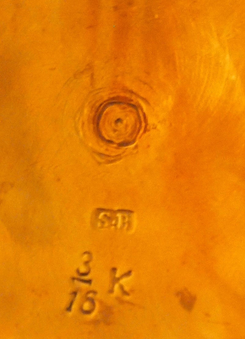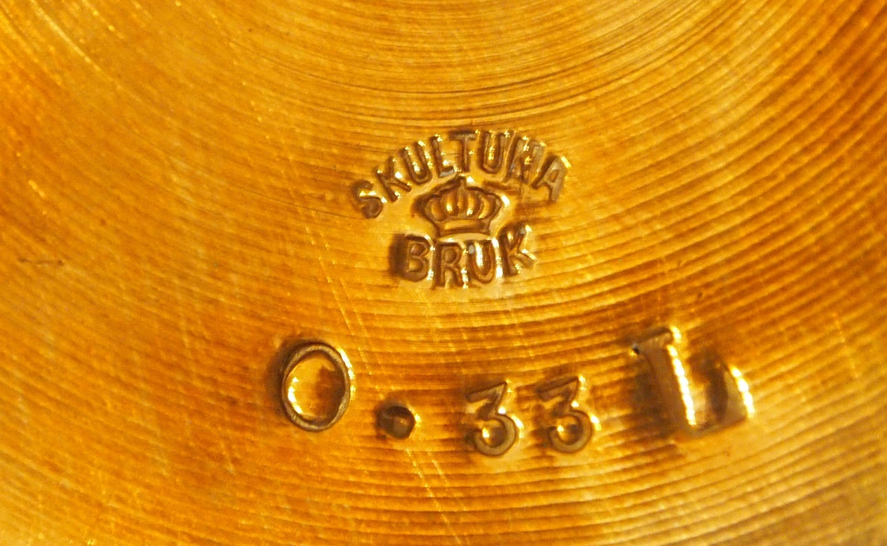 Böjd stämpel, Skultuna, krona i mitten, Bruk 0,33 L, höjd 14 cm.