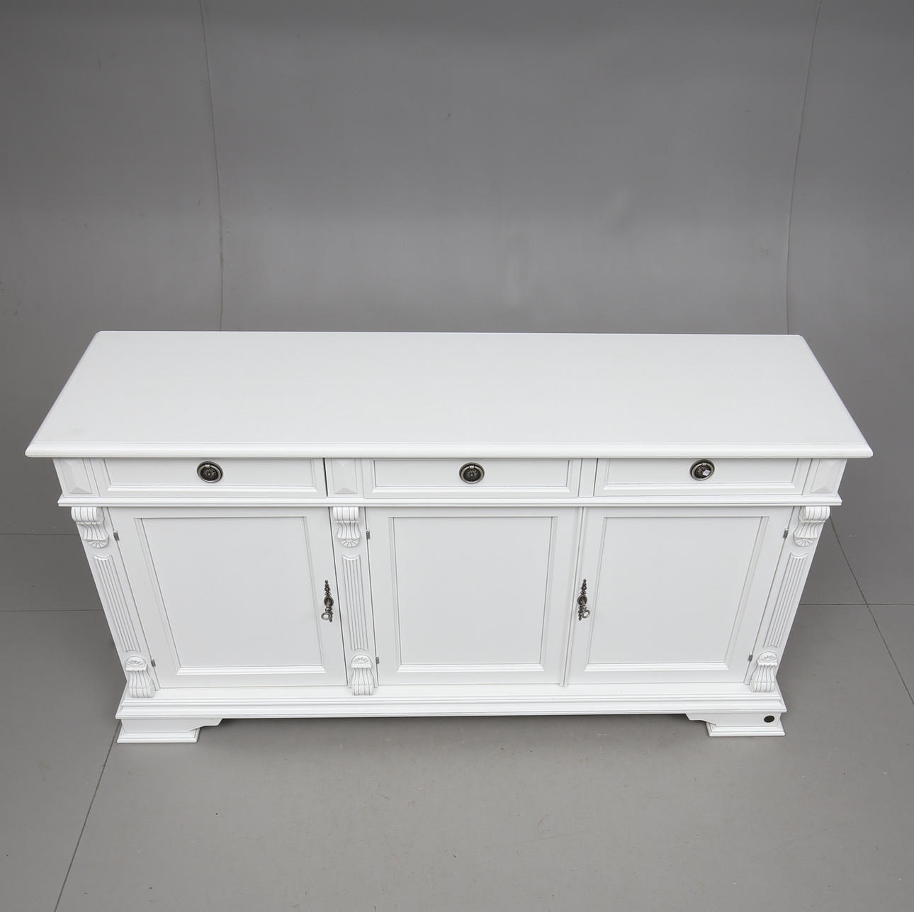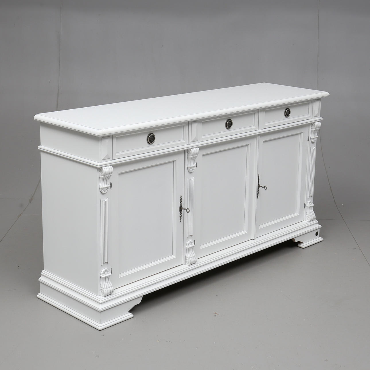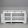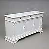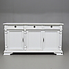 Målat. Skuren dekor. Tre lådor och tre dörrar med bakomliggande hyllplan. Längd 163. Bredd 47. Höjd 87 cm.
