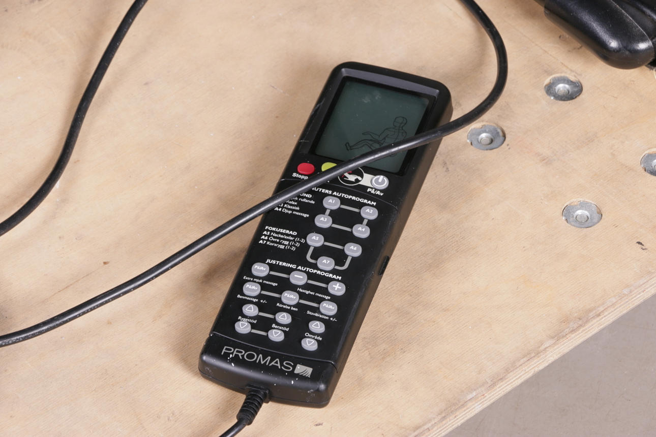 Massagefåtölj med flertalet massageprogram för återhämtning, styrs via fjärrkontroll. löstagbara armstöd vid transport