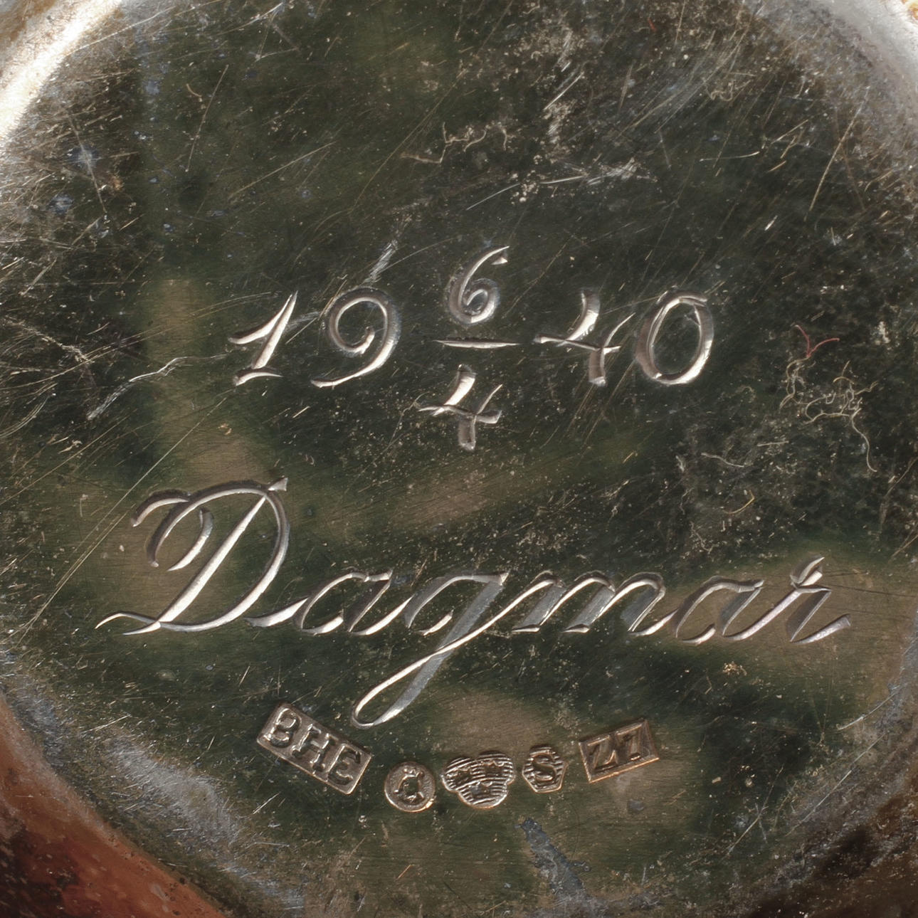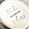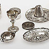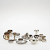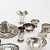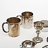 2 muggar, 4 servettringar, 1 lock, 1 glasask med silverlock, 2 skålar, 1 dekorhatt, 1 fat, 2 bägare, 1 pokal, 1 tumlare.