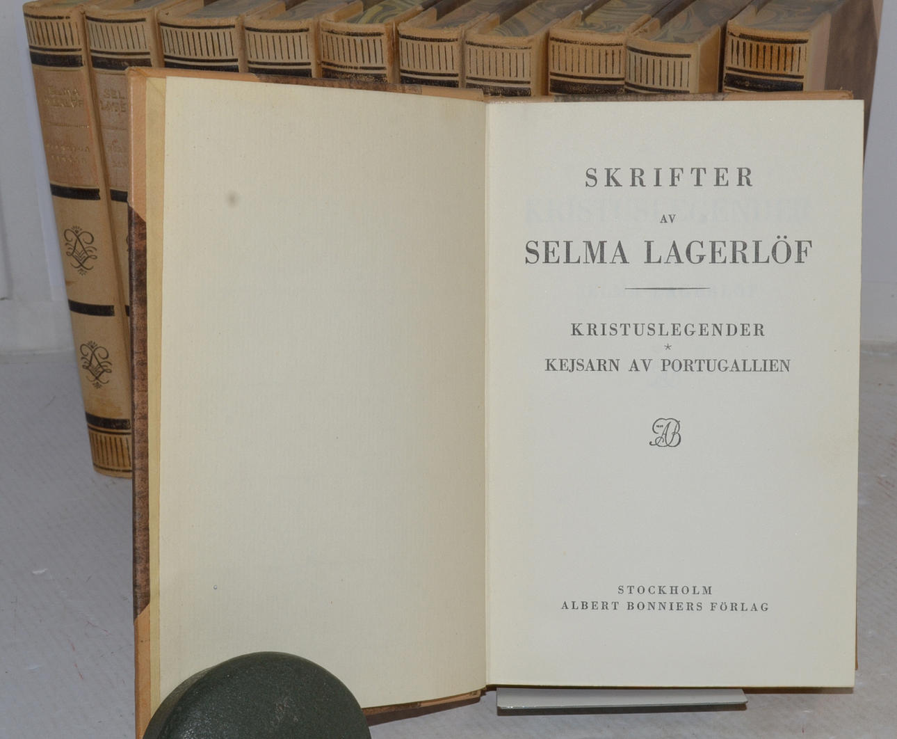 Albert Bonniers förlag 1933, ca 2 500s. 18 verk bundna i 12 förlagets ljusbruna halvfranska band med ryggdekor, marmorerade pärmar och övre guldsnitt.