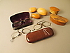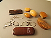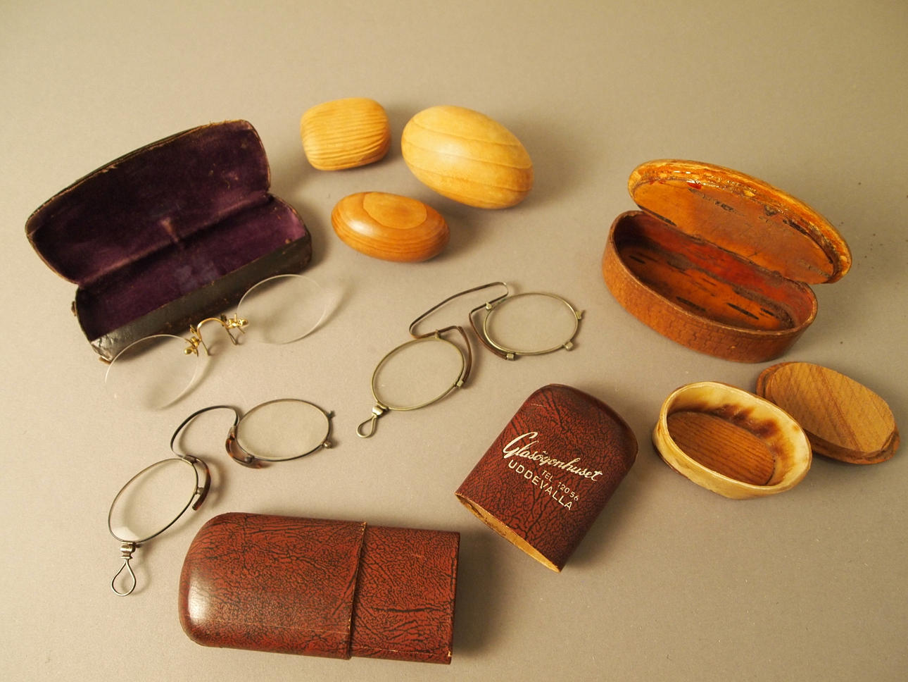 3 par glasögon, 2 st glasögonfodral, snusdosa i trä längd 9,5 cm, 3 st ägg i trä en ask i ben med trälock.