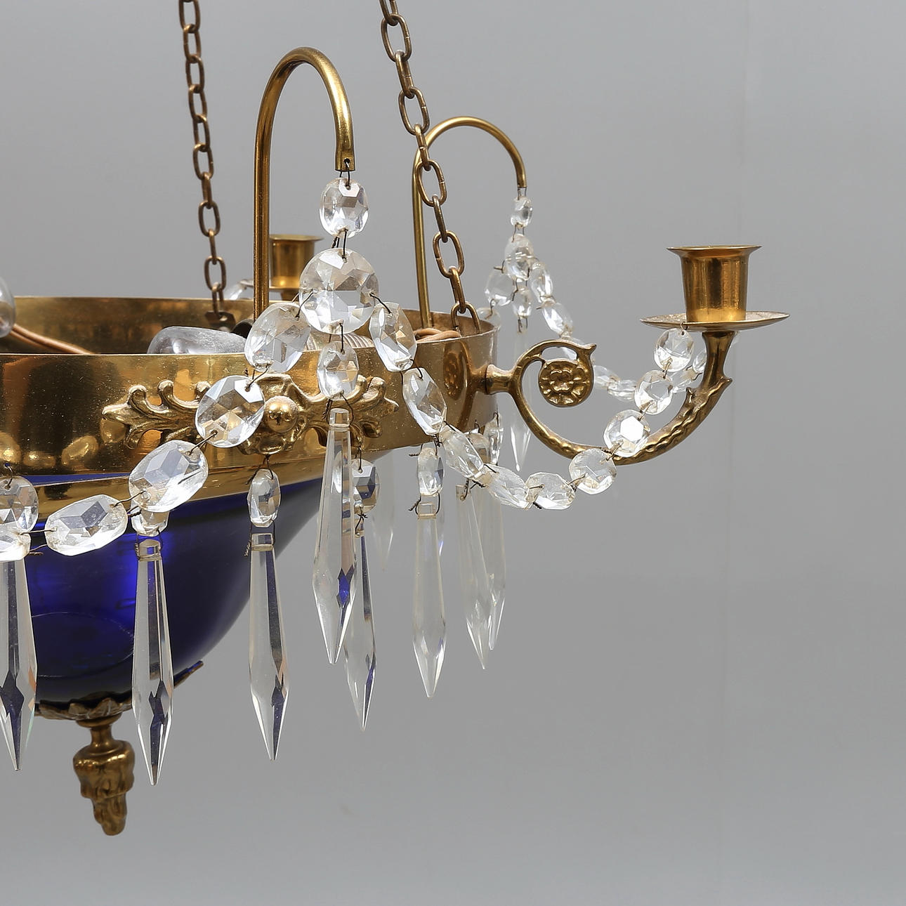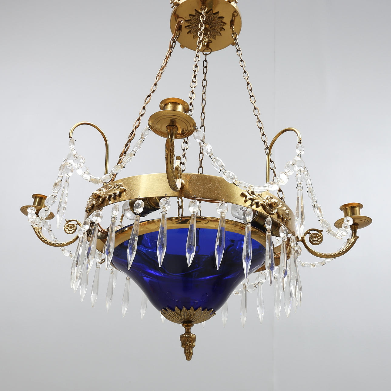 Behängd med prismor, 4 ljusarmar, diameter/längd ca 48 cm.