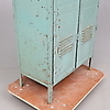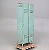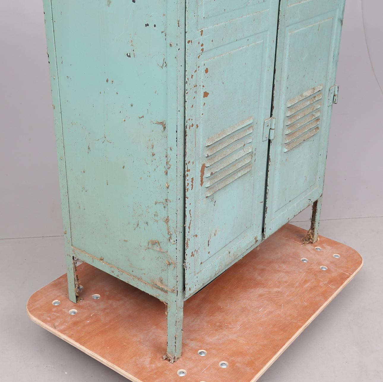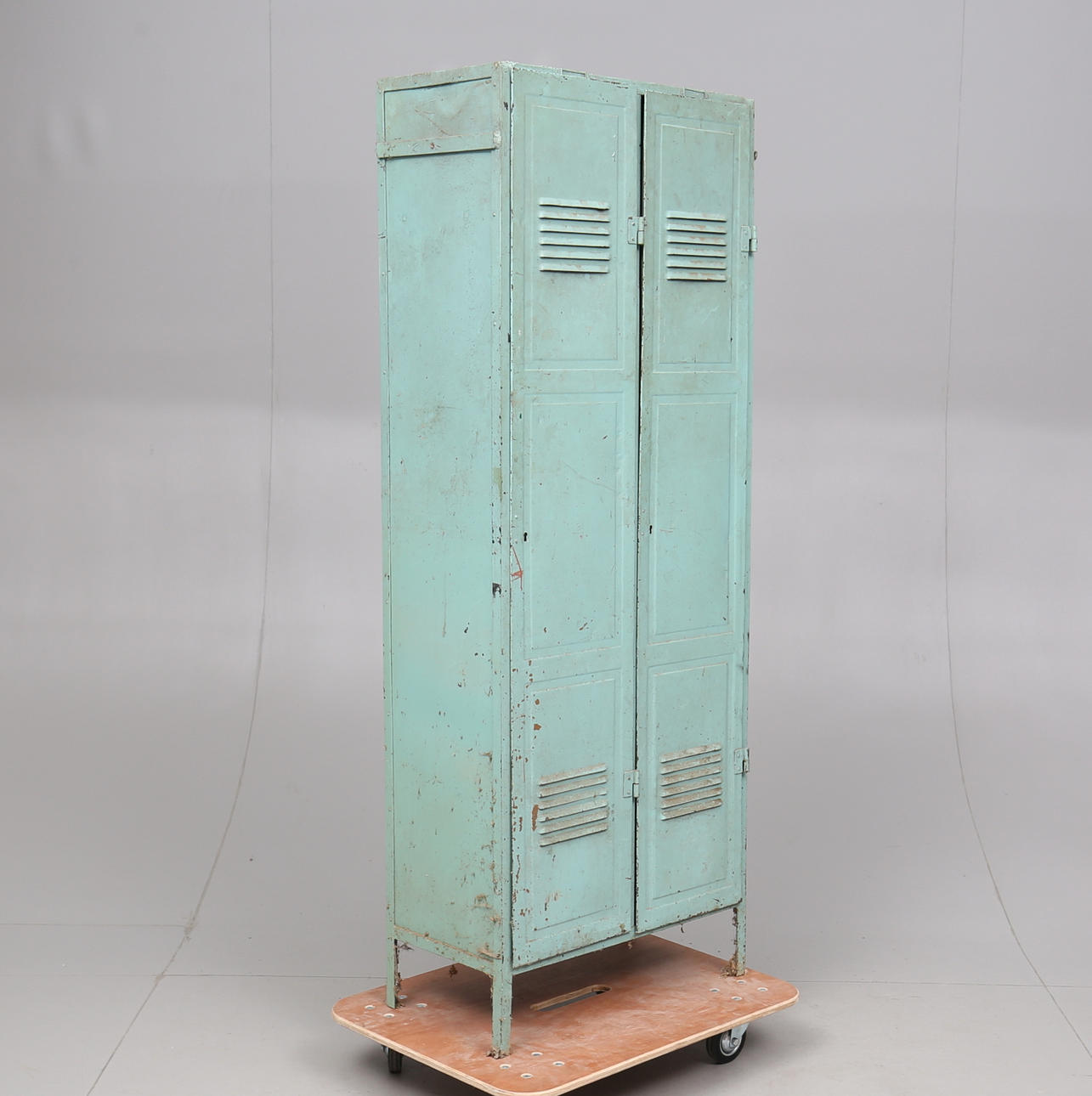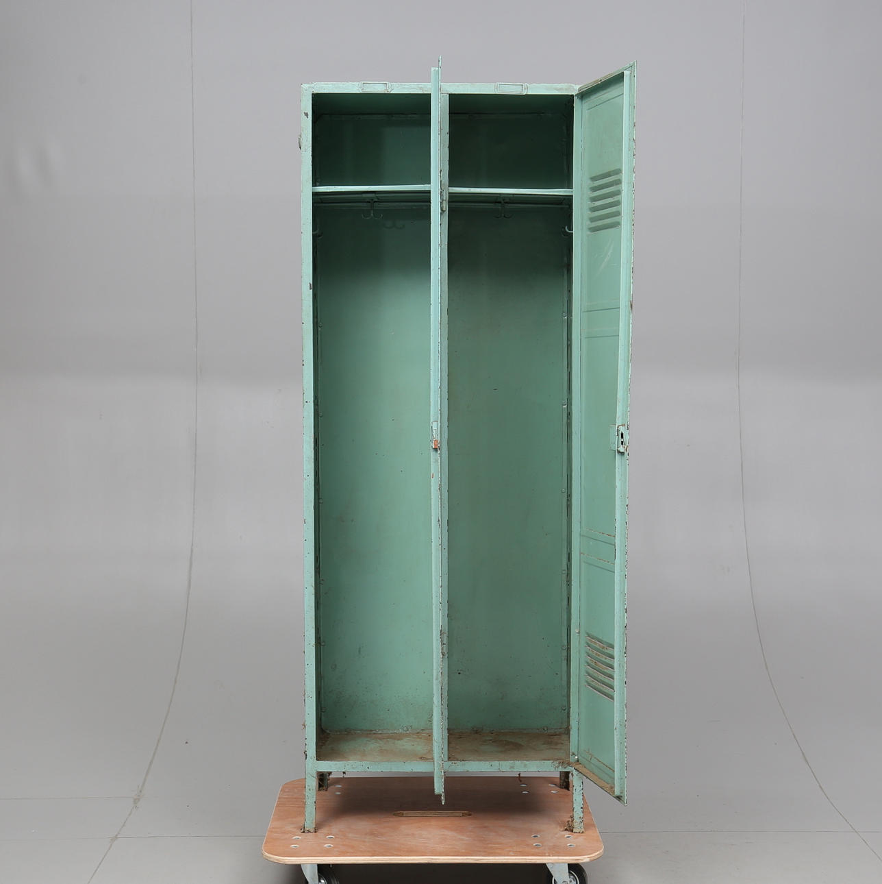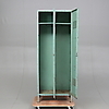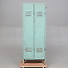 Målad metall. Två dörrar med bakomliggande förvaring. En gavel med krokar. Längd 68. Bredd 36. Höjd 180 cm.