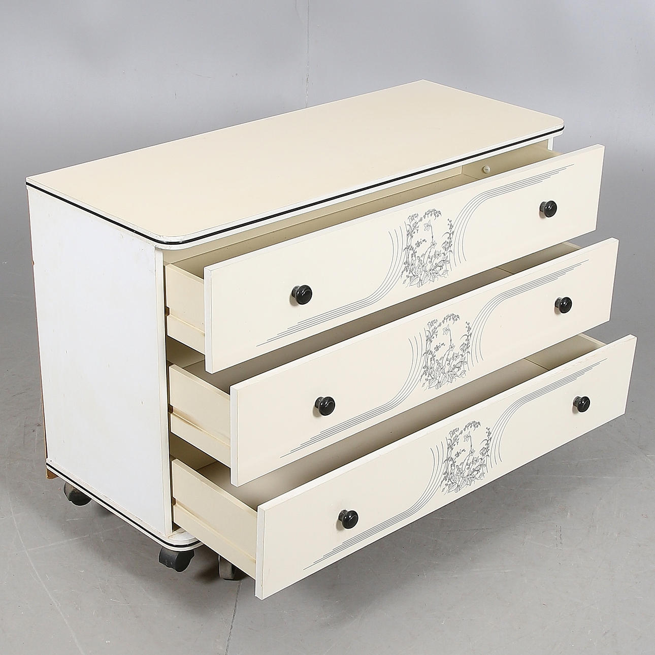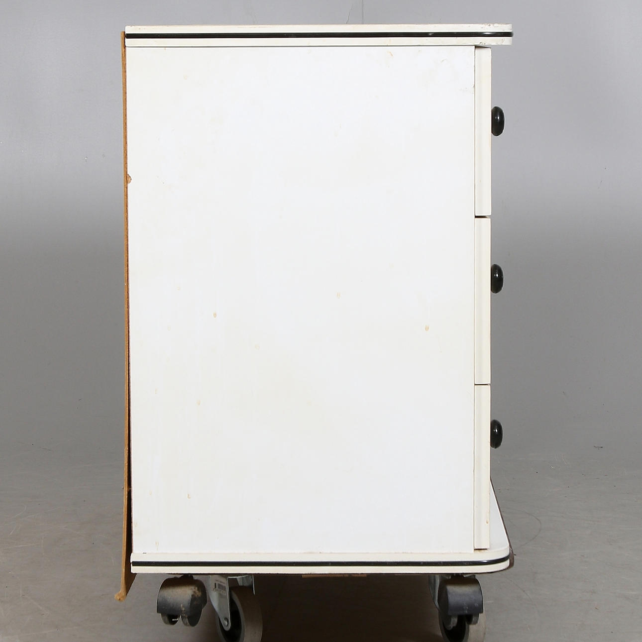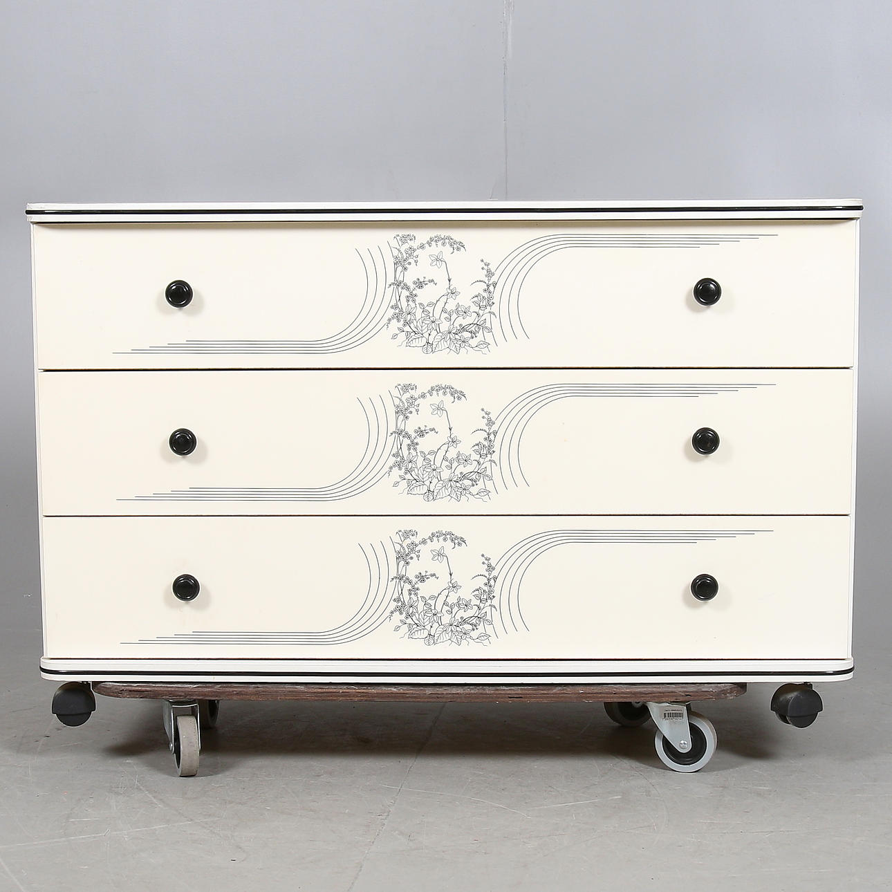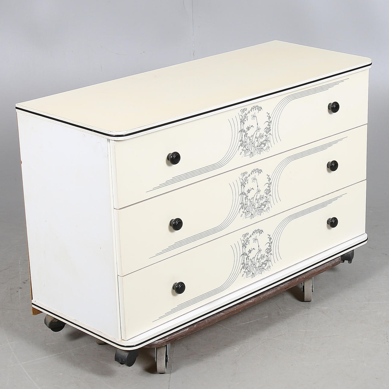På hjul med tre lådor, längd 99 cm, bredd 40 cm, höjd 64 cm.