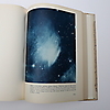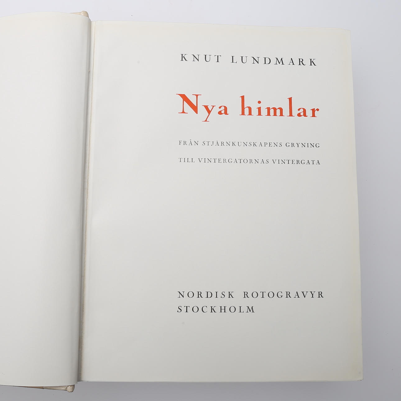 Nya himlar. Från stjärnkunskapens gryning till Vintergatornas Vintergata av Knut Lundmark. Nordisk Rotogravyr, Stockholm, 1943. Folio i ett exklusivt halvpergamentband med snyggt handskriven ryggtext och stänkta pärmar. Rikt illustrerade i s/v i texten och med en planschbilaga med 64 kolorerade planscher i slutet. 764 sid.