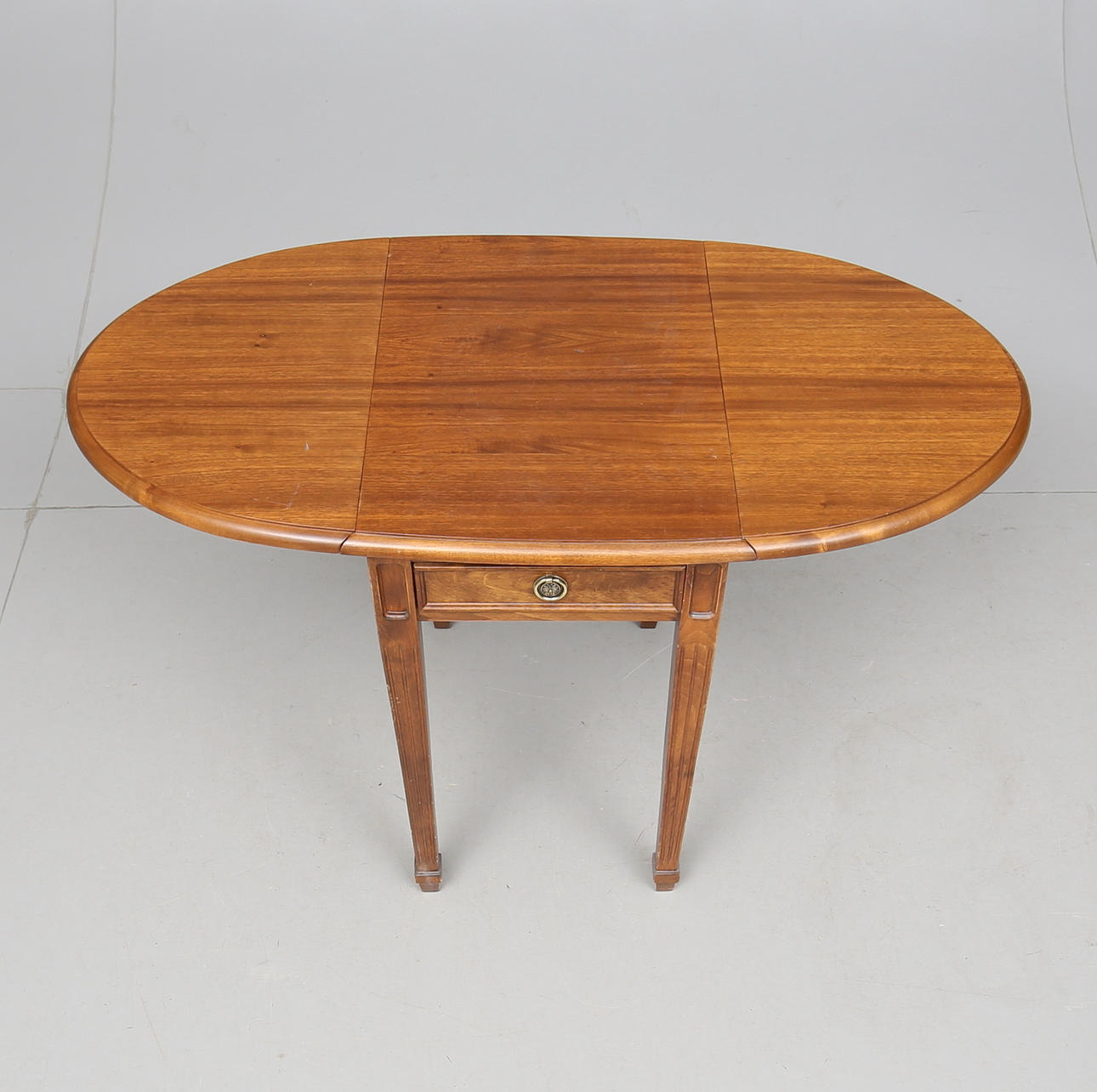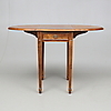 Fanerat med mahogny. Beslag av mässing. Skuren dekor. Två lådor i sarg. Två klaffar a 36 cm vardera. Längd 45. Bredd 58. Höjd 72 cm.