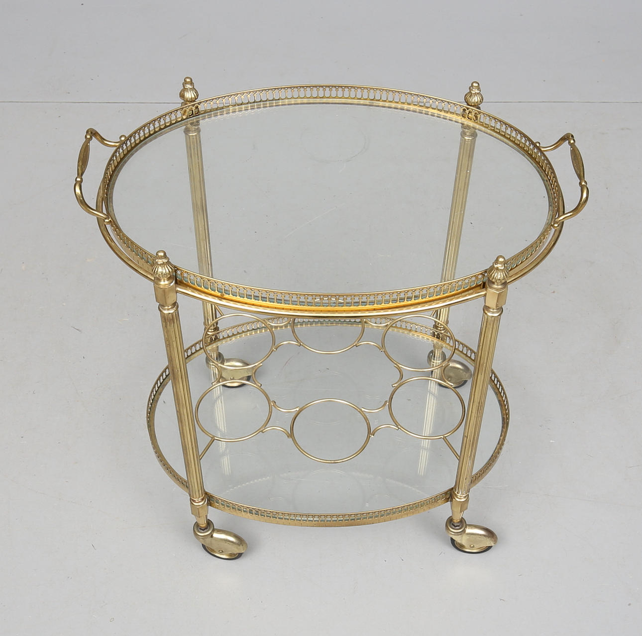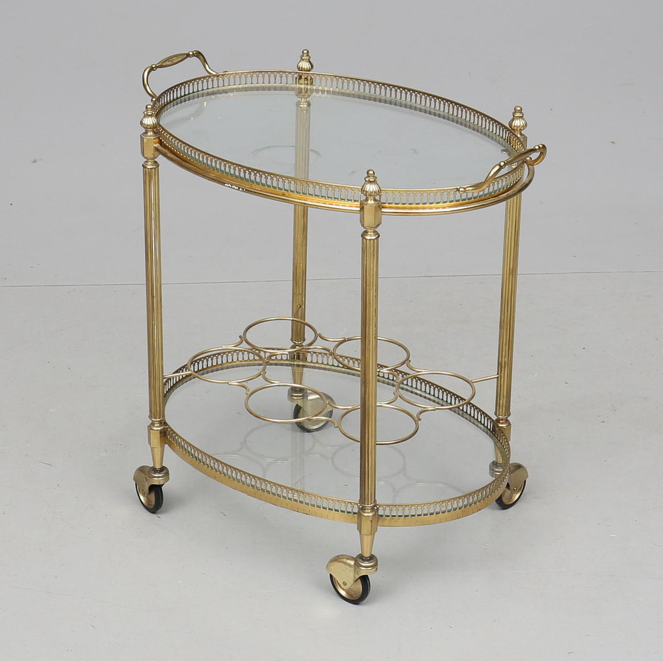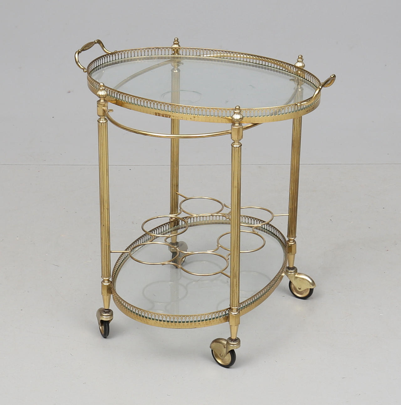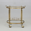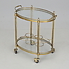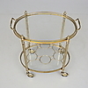 Stomme av mässing. Skivor av glas. Två hyllplan, varav undre hyllplan med flaskställ. Längd 56. Bredd 38. Höjd 59 cm.