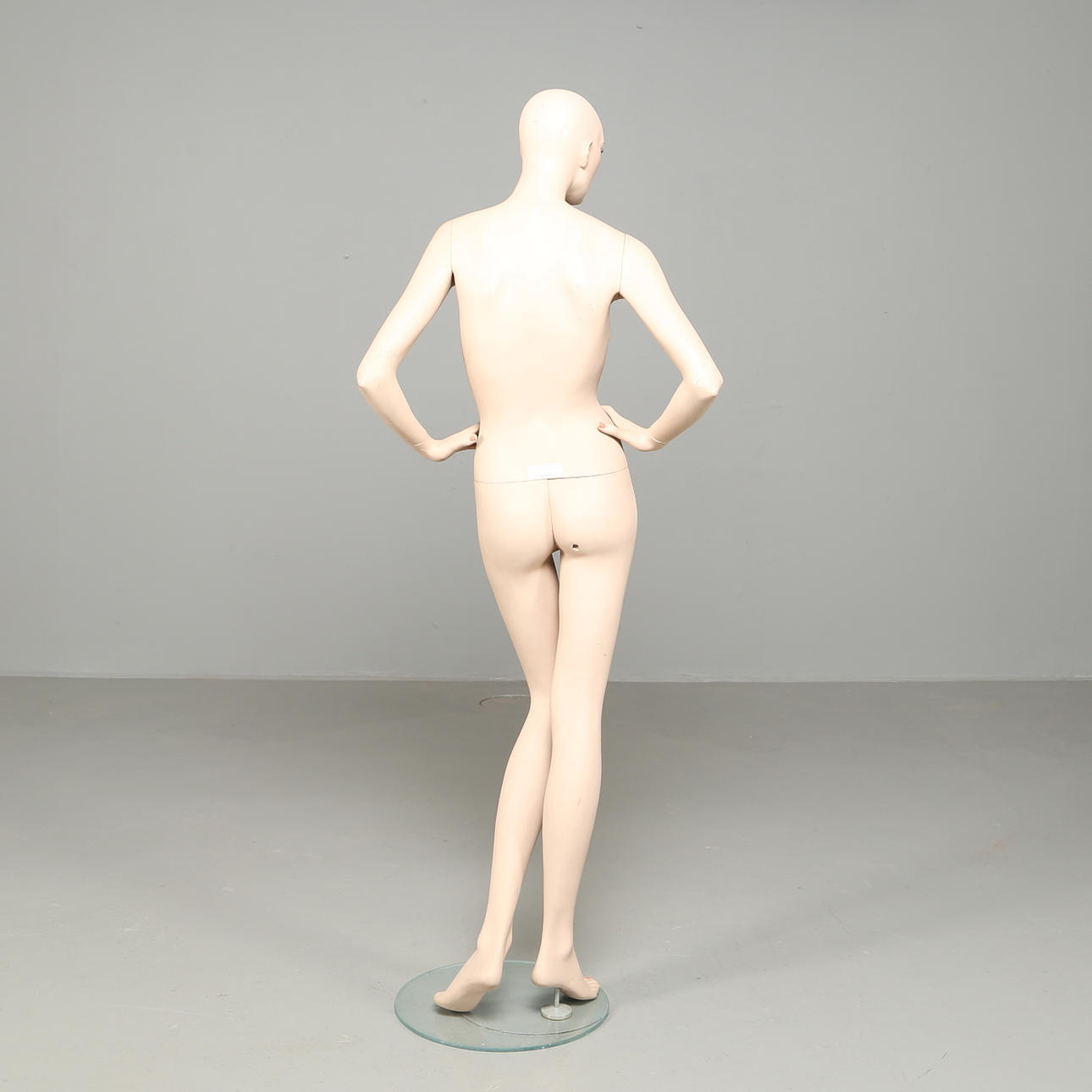 Ledad i midja samt axlar. Spraymålad med ögonhår och på rund sockel av klarglas. Etikettmärkt.