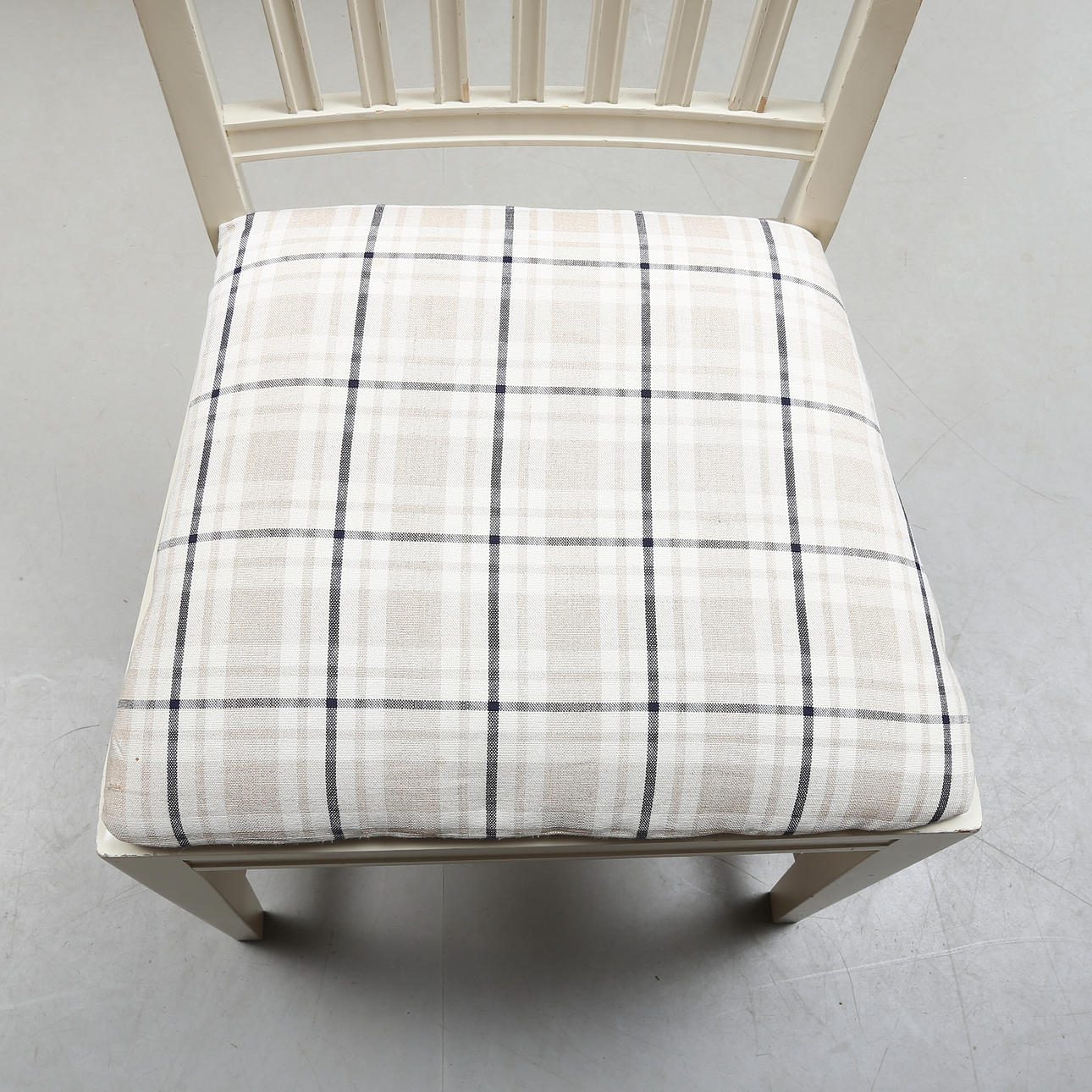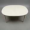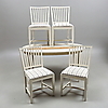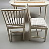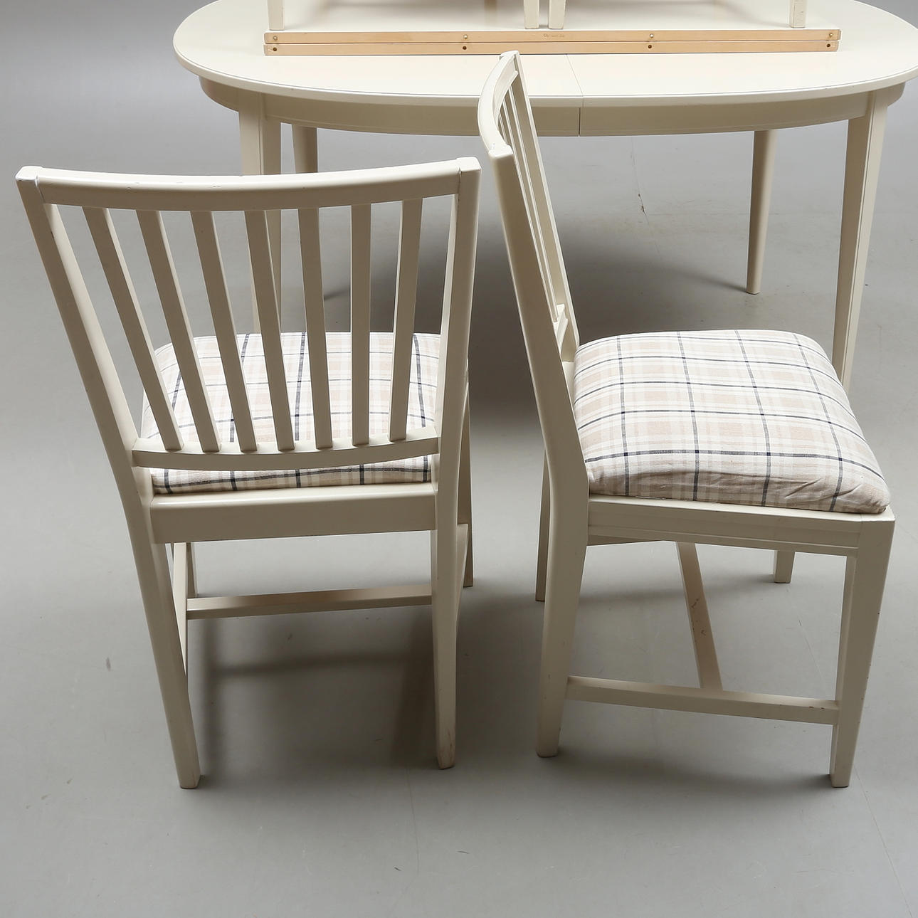 Bordets längd 140, bredd 100, höjd 74 cm, 2 iläggsskivor á 46 cm, stolarnas sitthöjd ca 45 cm.