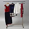 Dräkt med påsydda knappar samt kedja i silver längd 125 cm, omkrets midja 84 cm.
