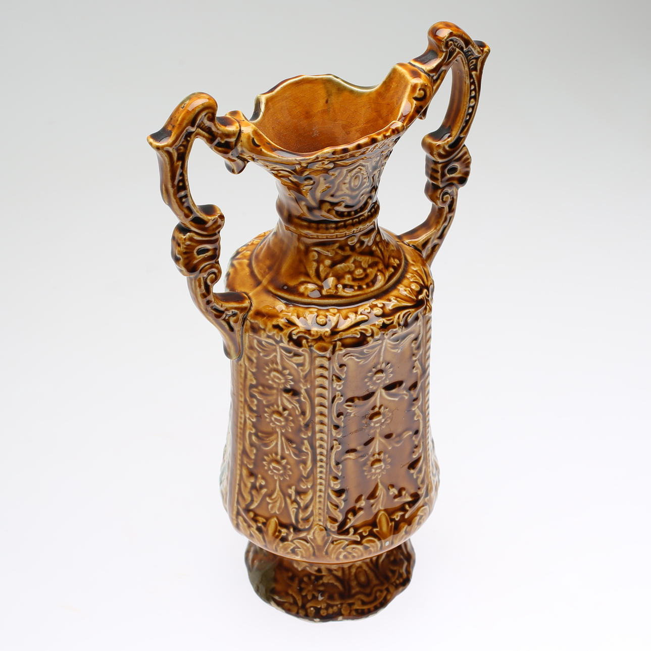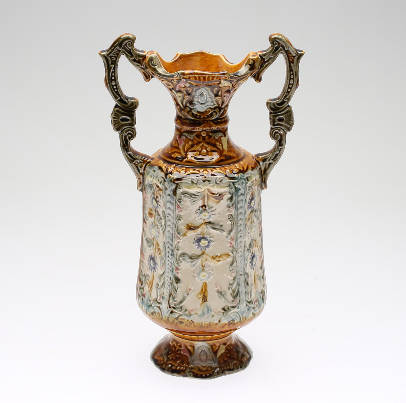 Uppsvängda hänklar. Dekor av bl a blommor och bladverk. Höjd ca 33 cm.