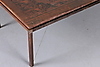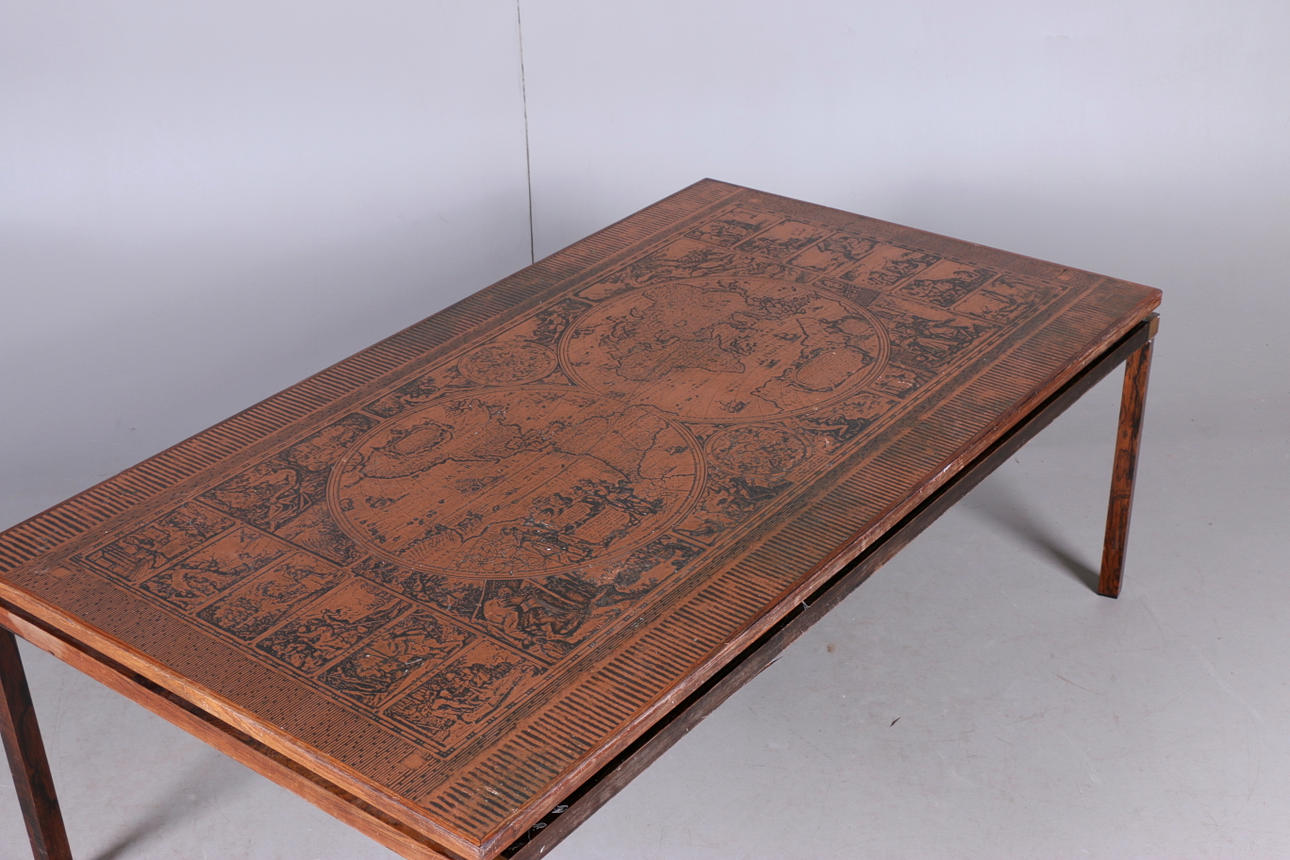 Soffbord med kopparbeklädd toppskiva med dekor av världsdelar Längd 80, bredd 140, höjd 50,5 cm.