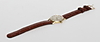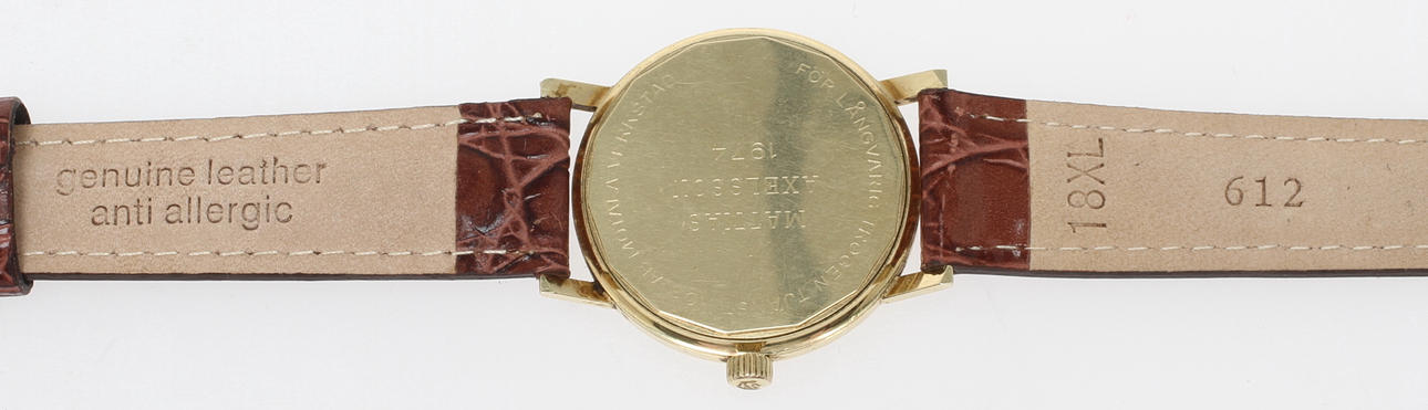 Yttre diameter ca 3,5 cm. Armband i läder.