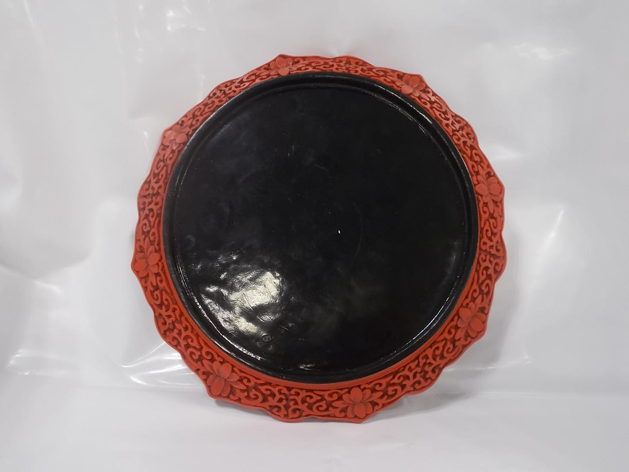 trä röd lackplatta från Kina, diameter ca 24 cm, ca 3 cm hög, ca 1900.