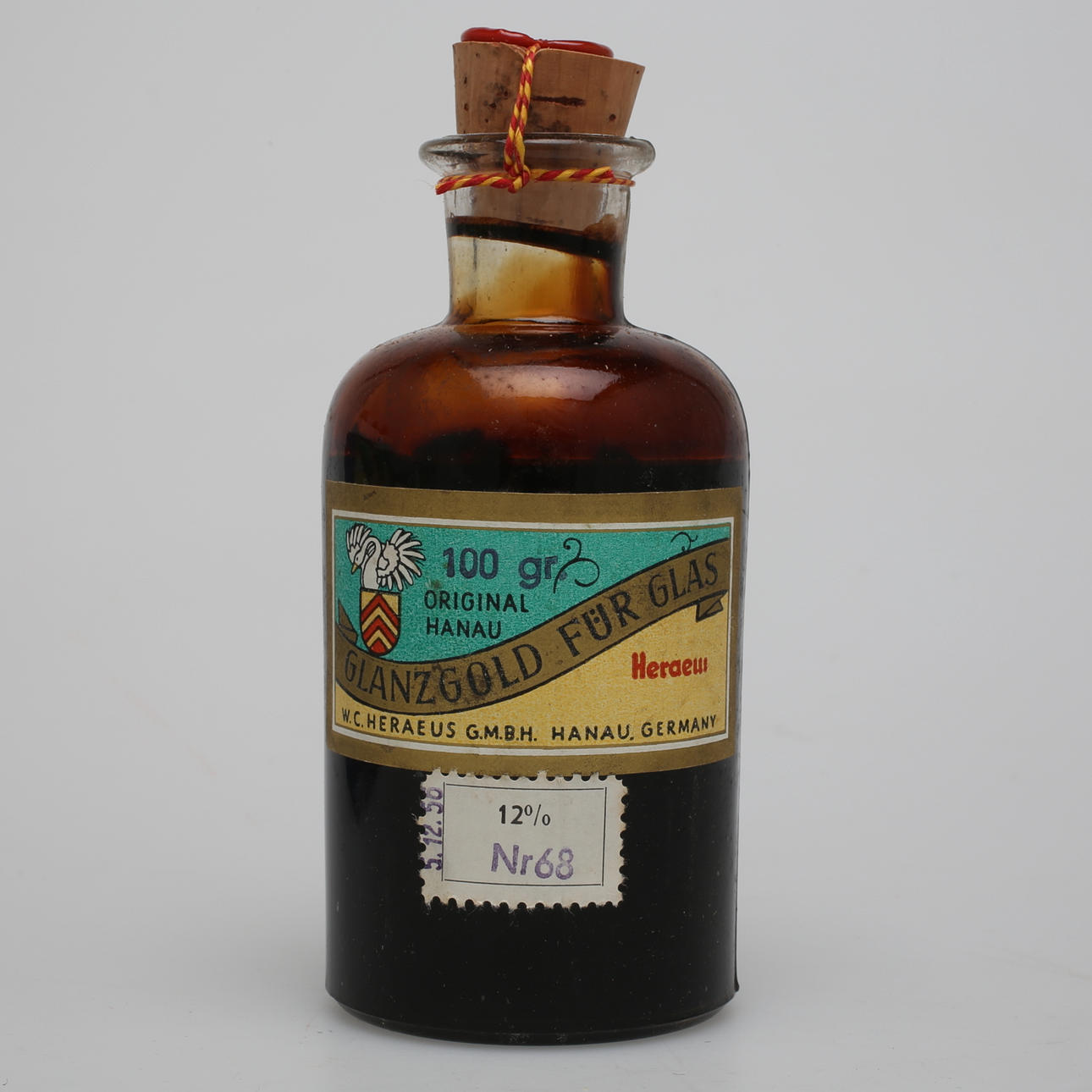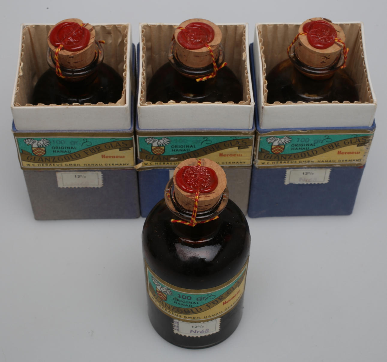 Fyra oöppnade flaskor med totalt 400 gram glansguld från 1950-talet.