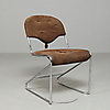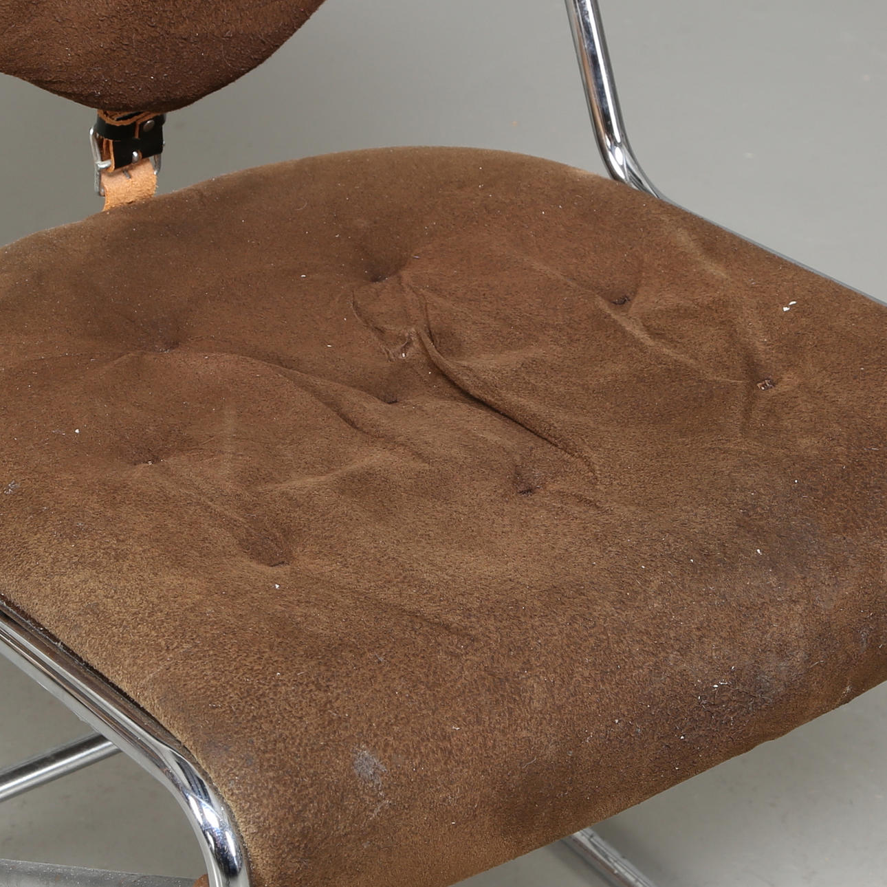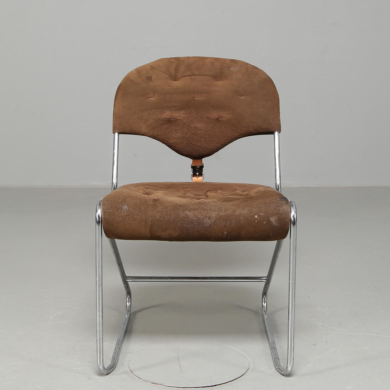Stomme av kromat metallrör, klädd i brun alcantara. Skinnspänne i ryggen. Bredd 47 cm Djup 58 cm Höjd 76 cm Sitthöjd 43 cm.