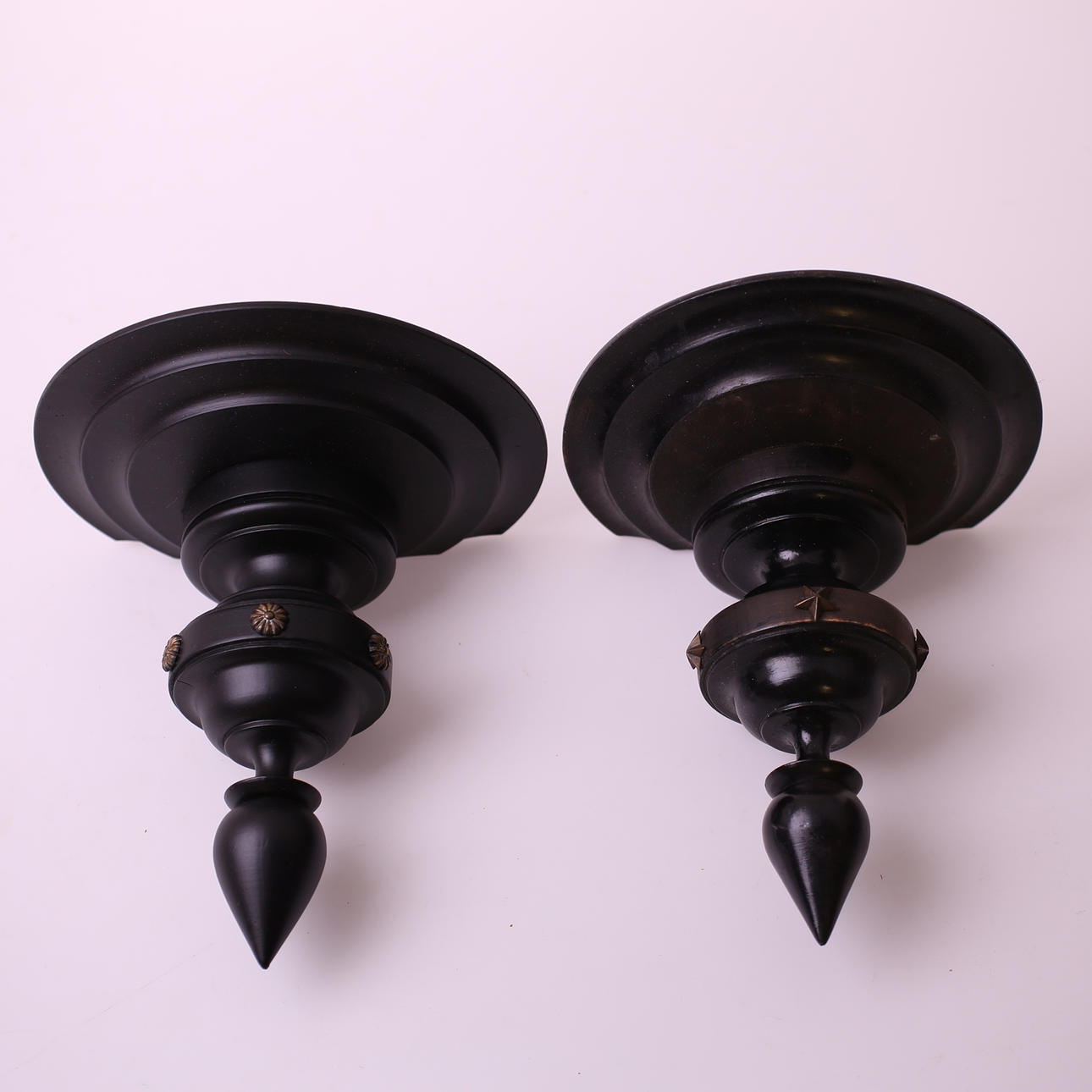 Två snarlika svarta vägghyllor, trä, höjd 19 cm bredd 17 cm + höjd 19 cm bredd 16 cm.