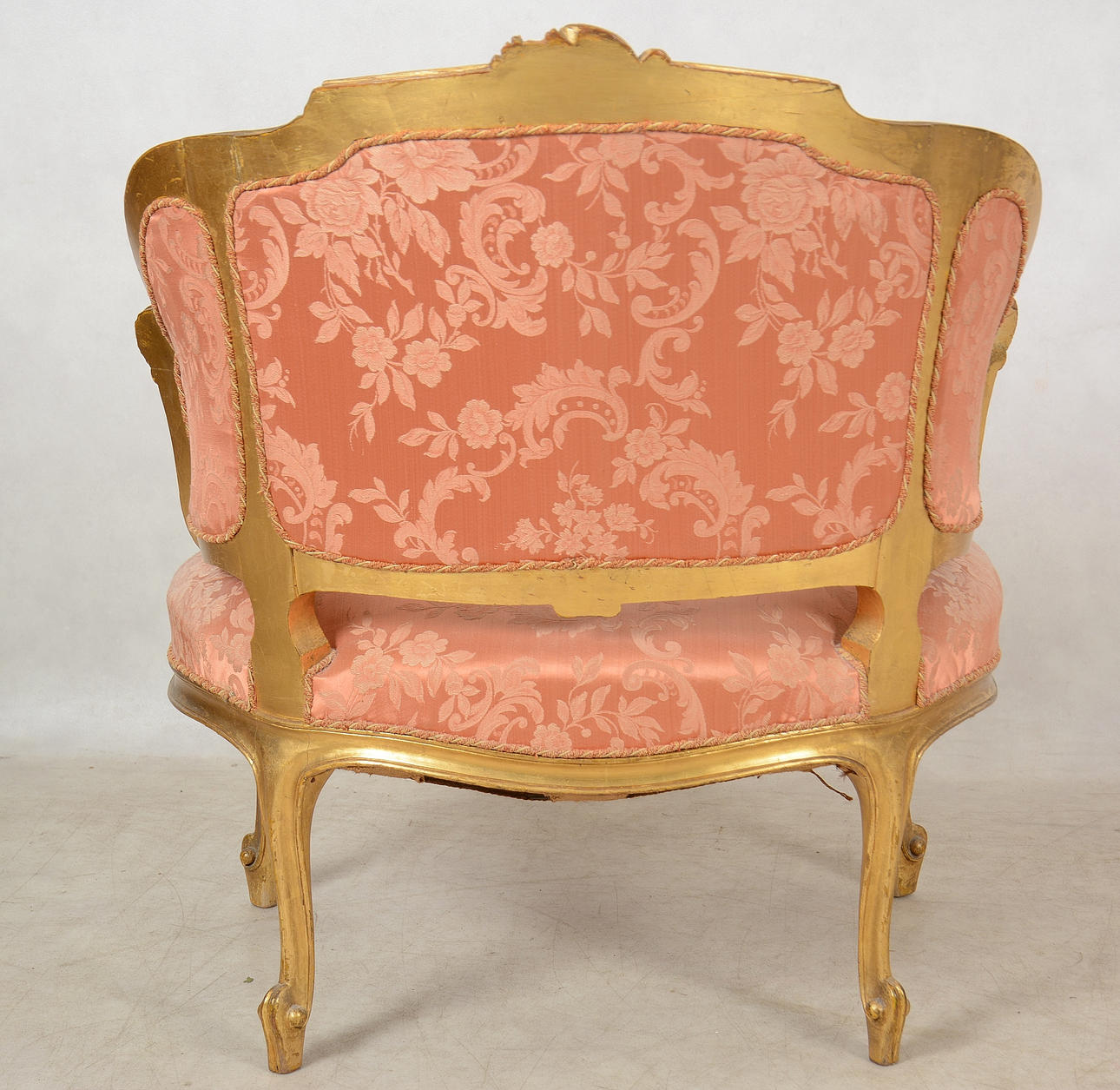 Stomme förgylld, sits och rygg beklädd, bredd 77 cm, rygghöjd 84 cm.