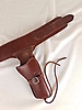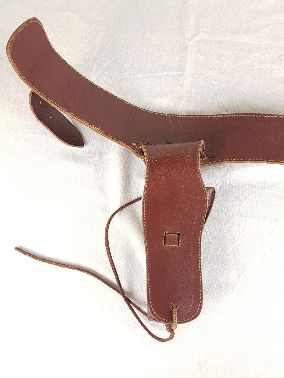 patronbälte med pistolhölster, brunt läder, läderremmar som benhållare, med dekorativa patroner, längd ca.. 103 cm.