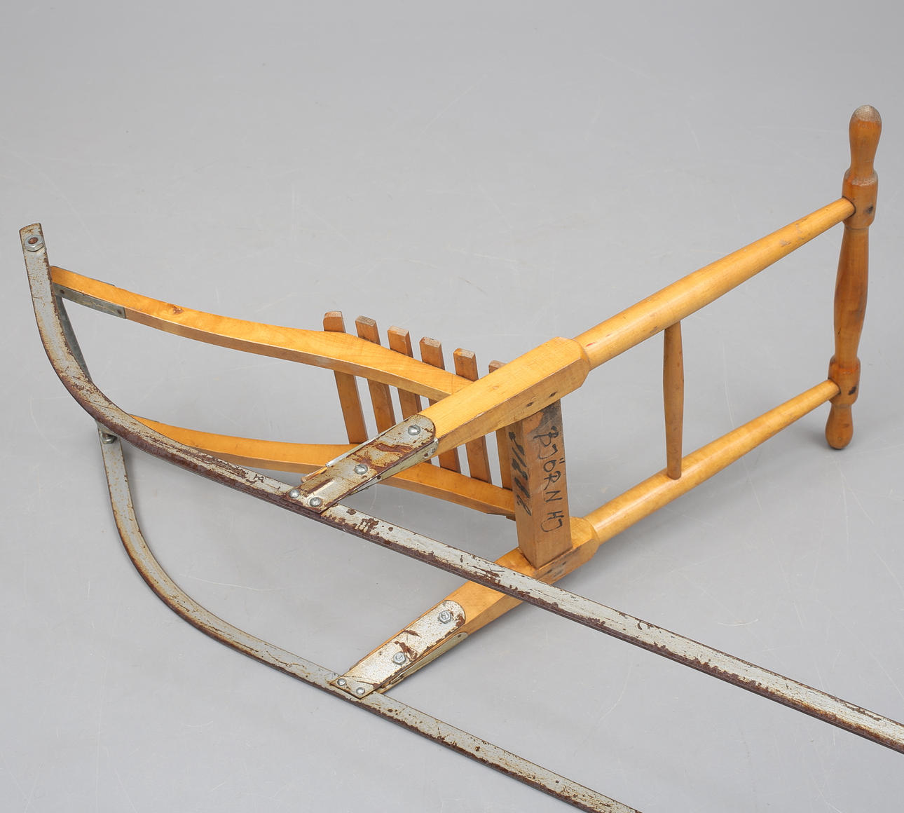 Slitage, namn skrivet med tusch, medar med rostfläckar.