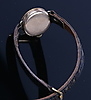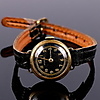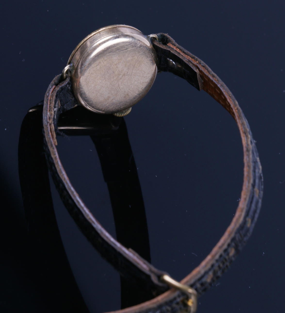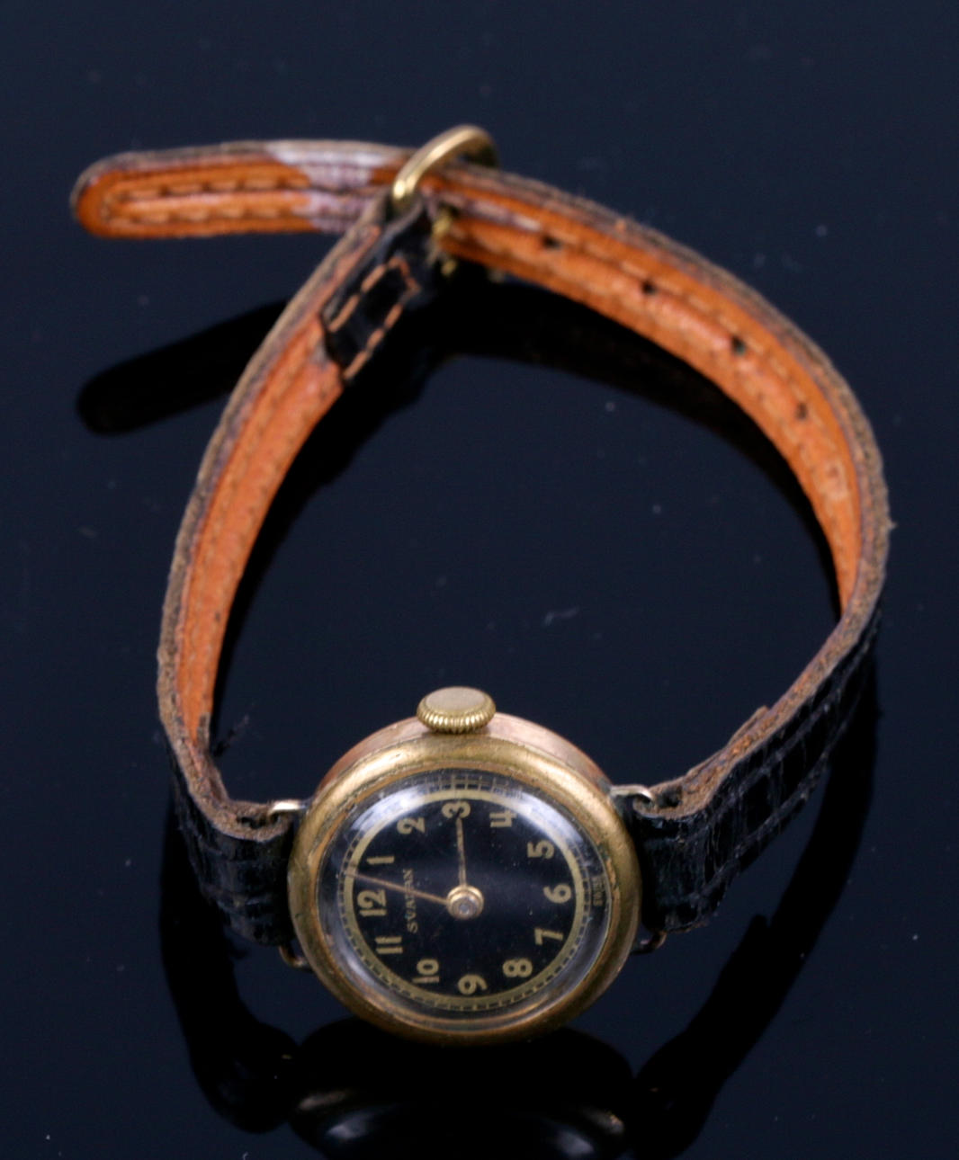 Damur med boett i 14 k guld. Armband i svart läder. Diameter boett 2 cm. Totalvikt 11,47 gram.