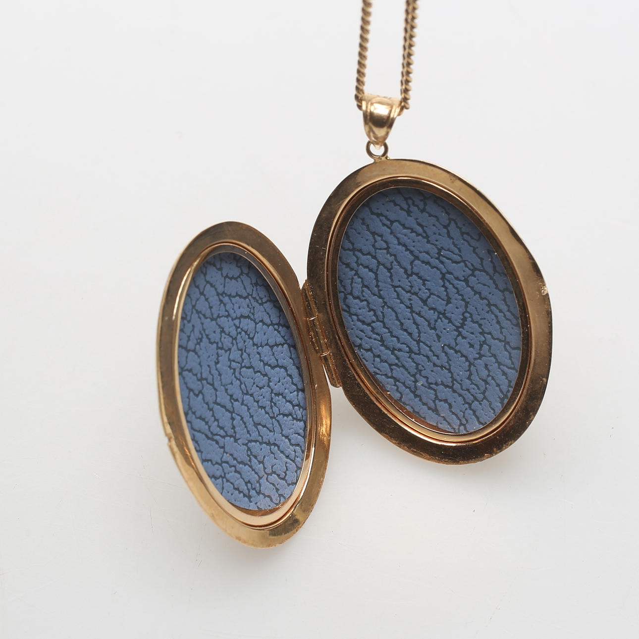 Kedjans längd ca 60 cm. Medaljongens storlek ca 3x4 cm.