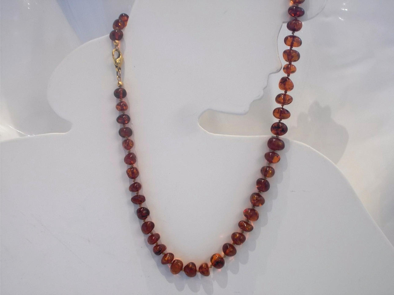 Bärnstensfärgad collier, från ca 1 till 1,5 cm med lås i äkta guld, längd ca 60 cm.