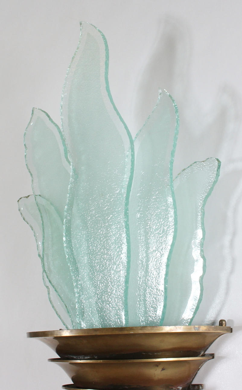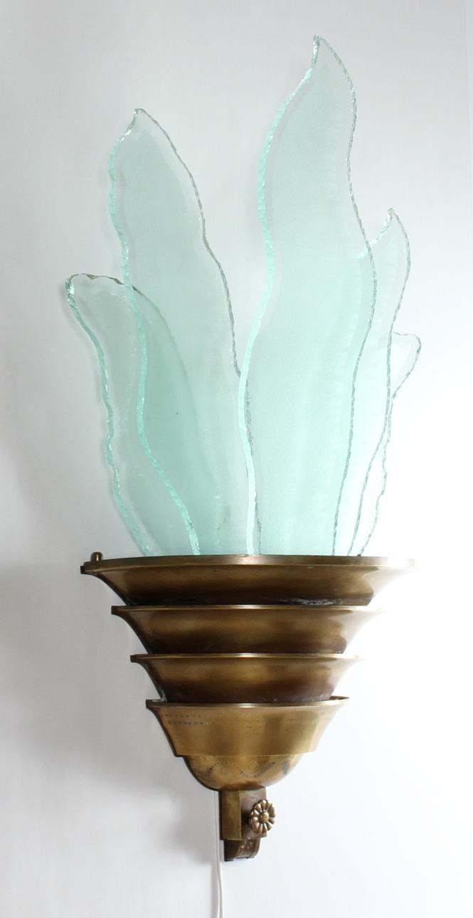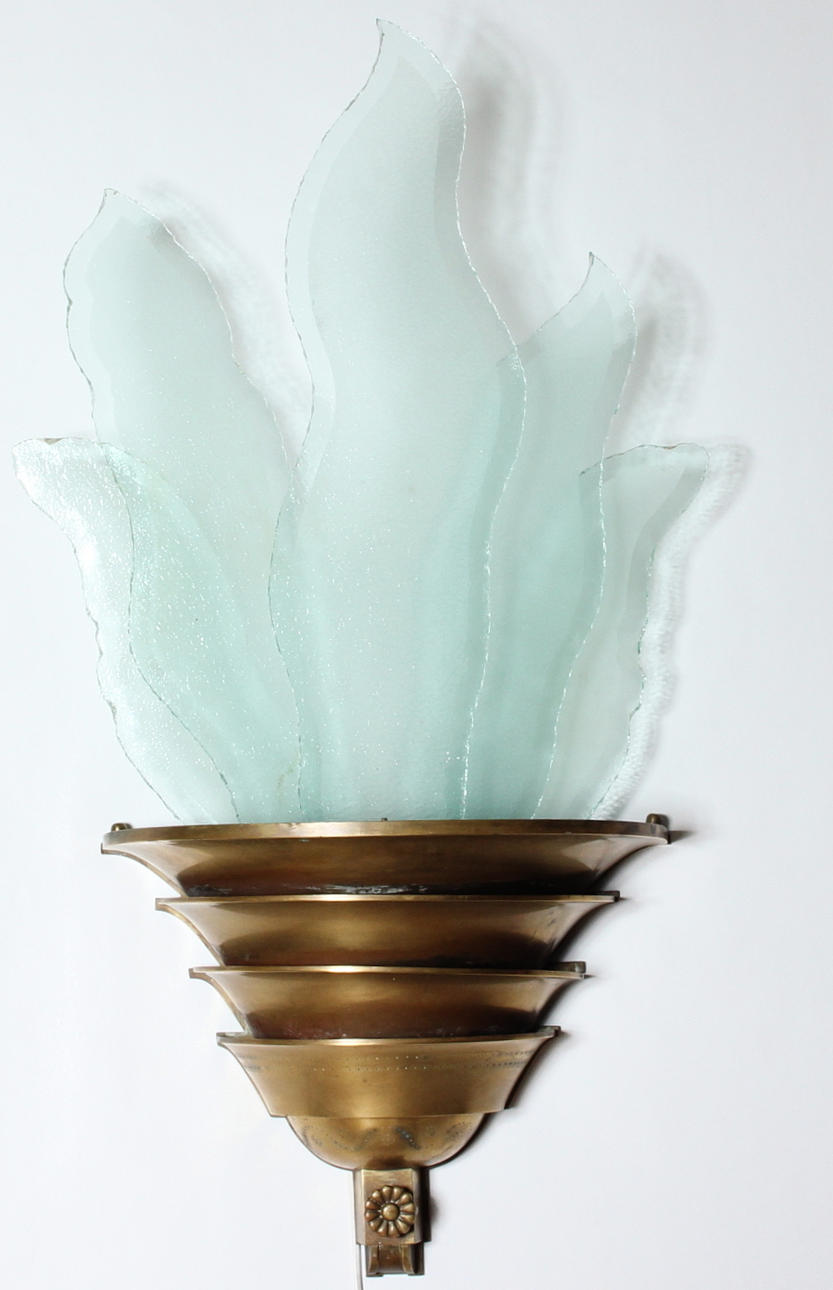 Stor väggbelysning från en hotellfoajé, 5 st. glasskivor formade som lågor, total höjd 87 cm.