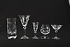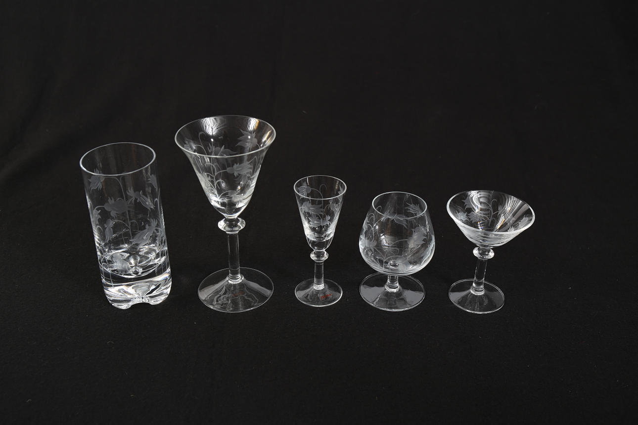 12 vinglas, höjd 17 cm 12 snapsglas, höjd 12 cm 6 likörglas, höjd 10 cm 6 cognacskupor, höjd 10 cm 6 grogglas, höjd 15 cm Originalkartonger medföljer.