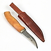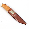 Skaft av björk, stålblad märkt "Lillehammer '94", längd 8,5 cm. Slida av läder med plakett märkt Lillehammer ´94. Totallängd 21,5 cm.