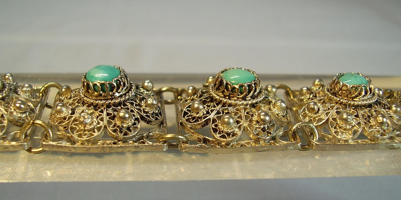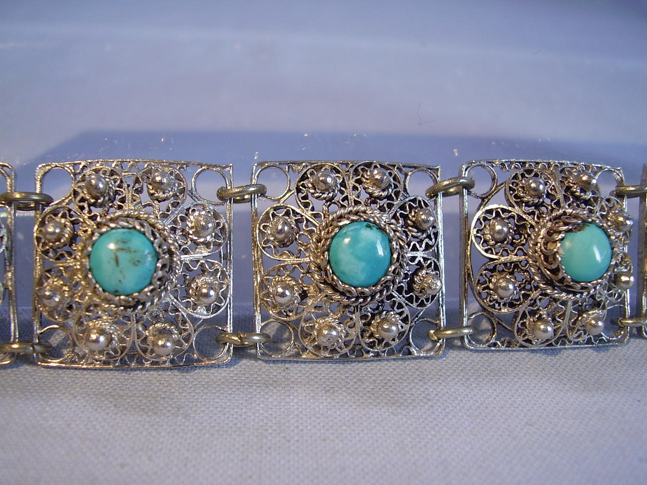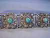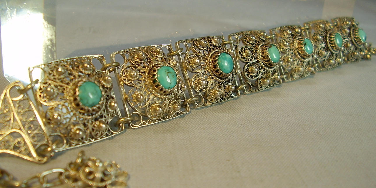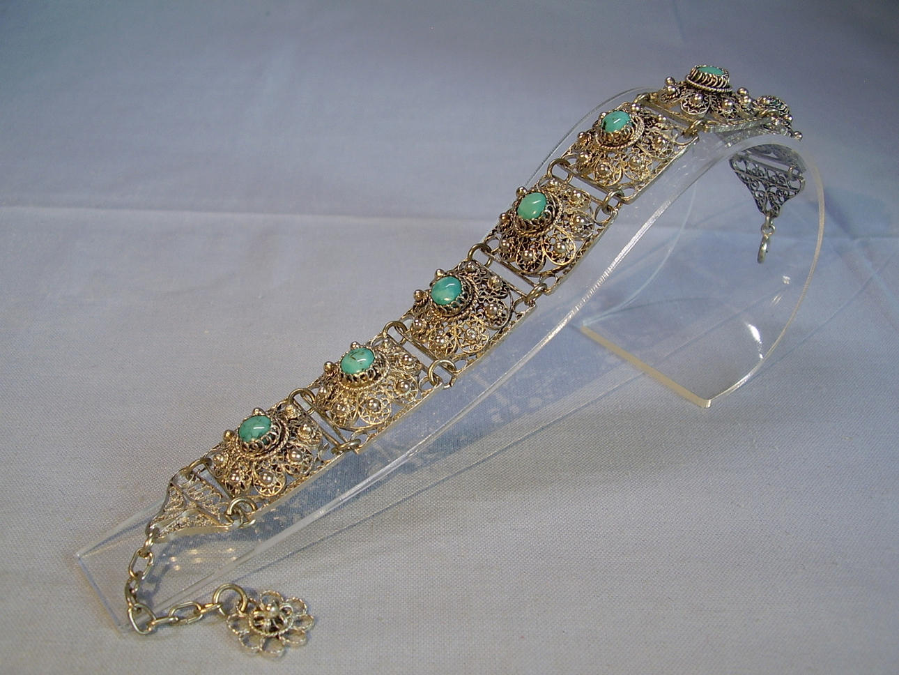 Den är gjord av sju filigran länkar, varje uppsättning med en rund naturlig turkos cabochon.