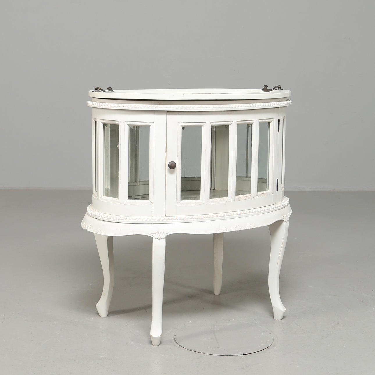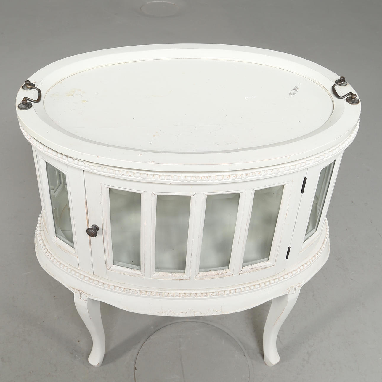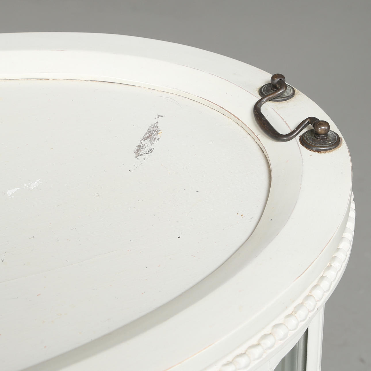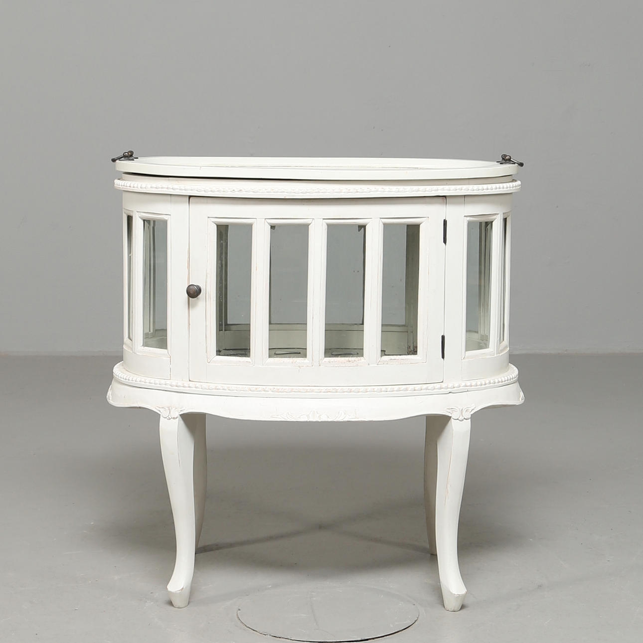 Oval form, lös bricka med metallhandtag, svängda ben, skuren dekor, pärllist, vitrindel i fasettslipat glas med spröjs, höjd 76 cm, bredd 47 cm.