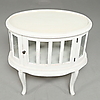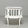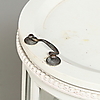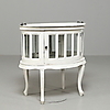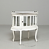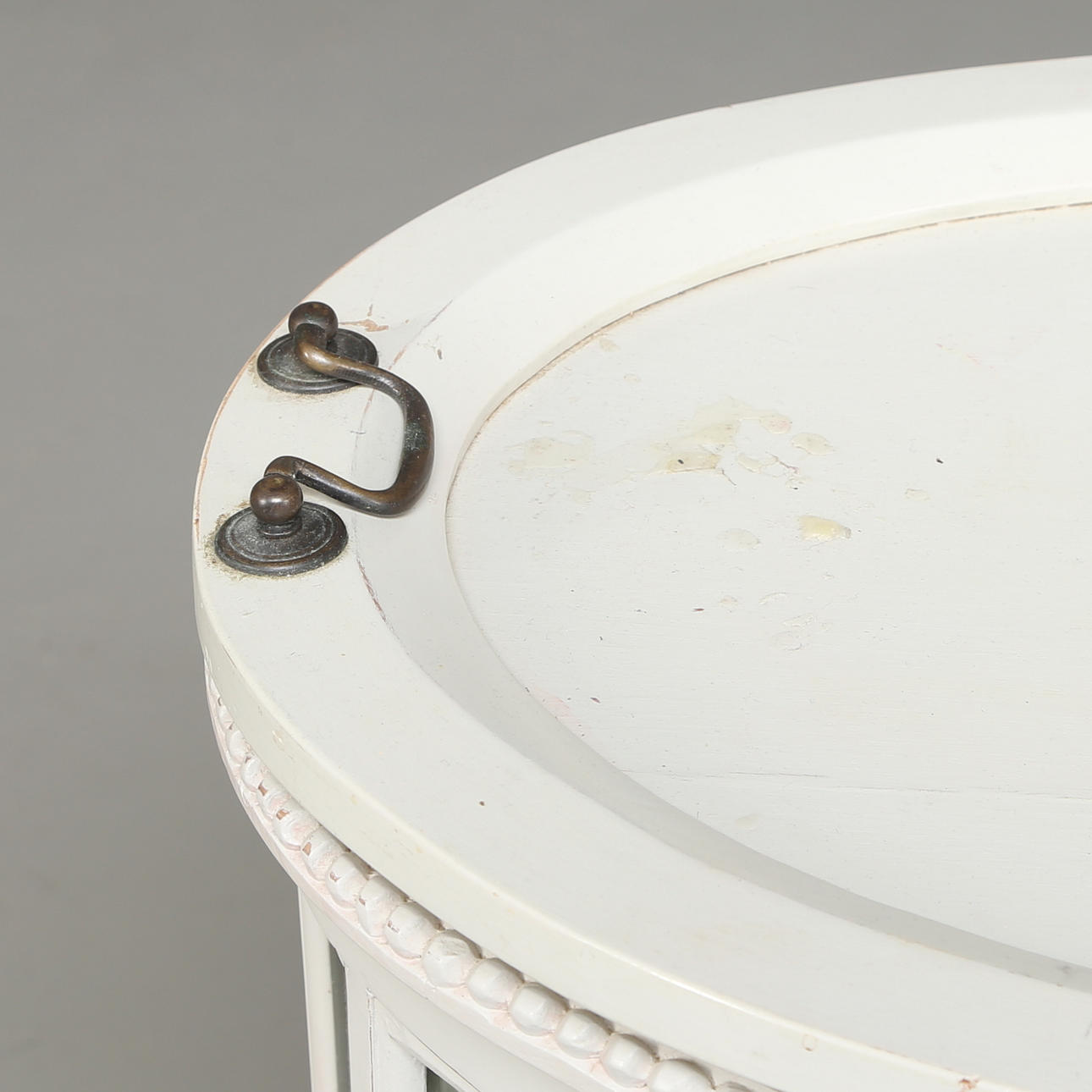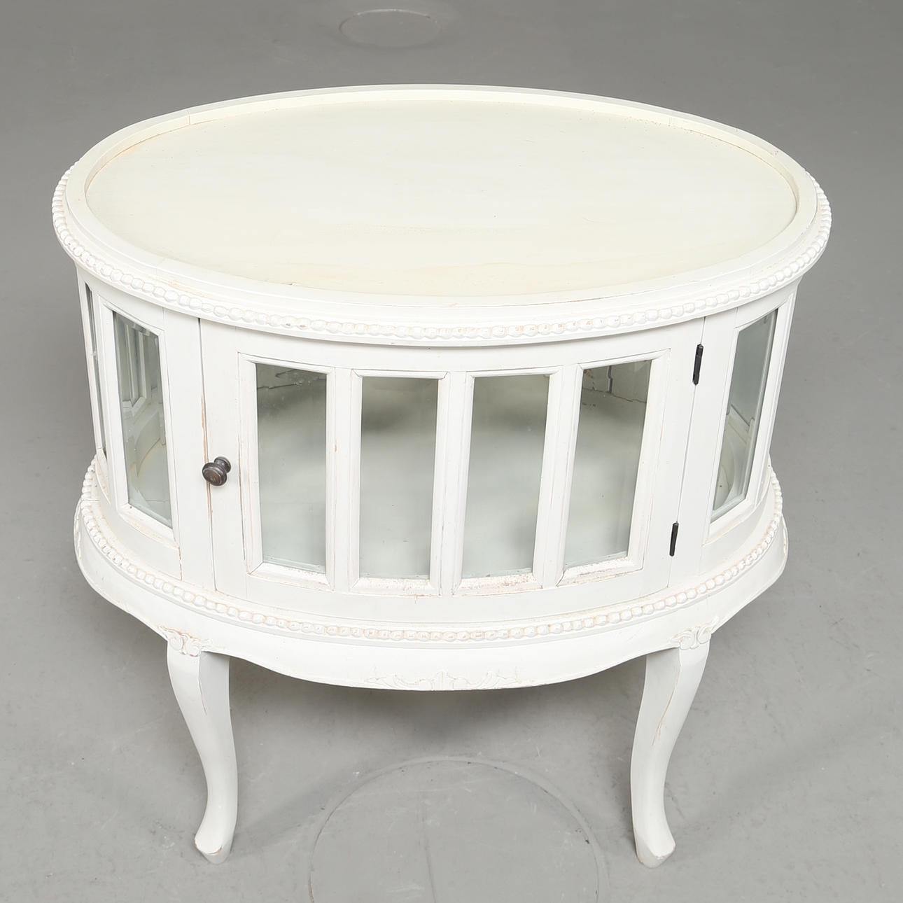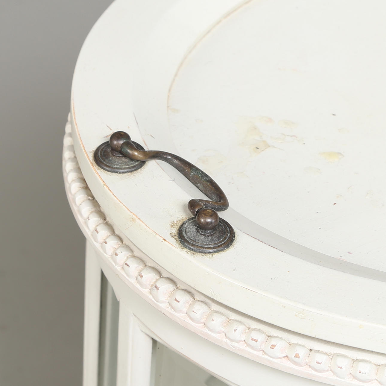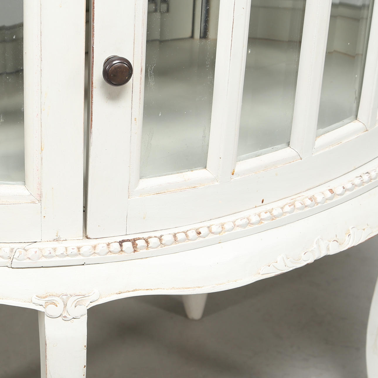 Oval form, lös bricka med metallhandtag, svängda ben, skuren dekor, pärllist, vitrindel i fasettslipat glas med spröjs, höjd 76 cm, bredd 47 cm.