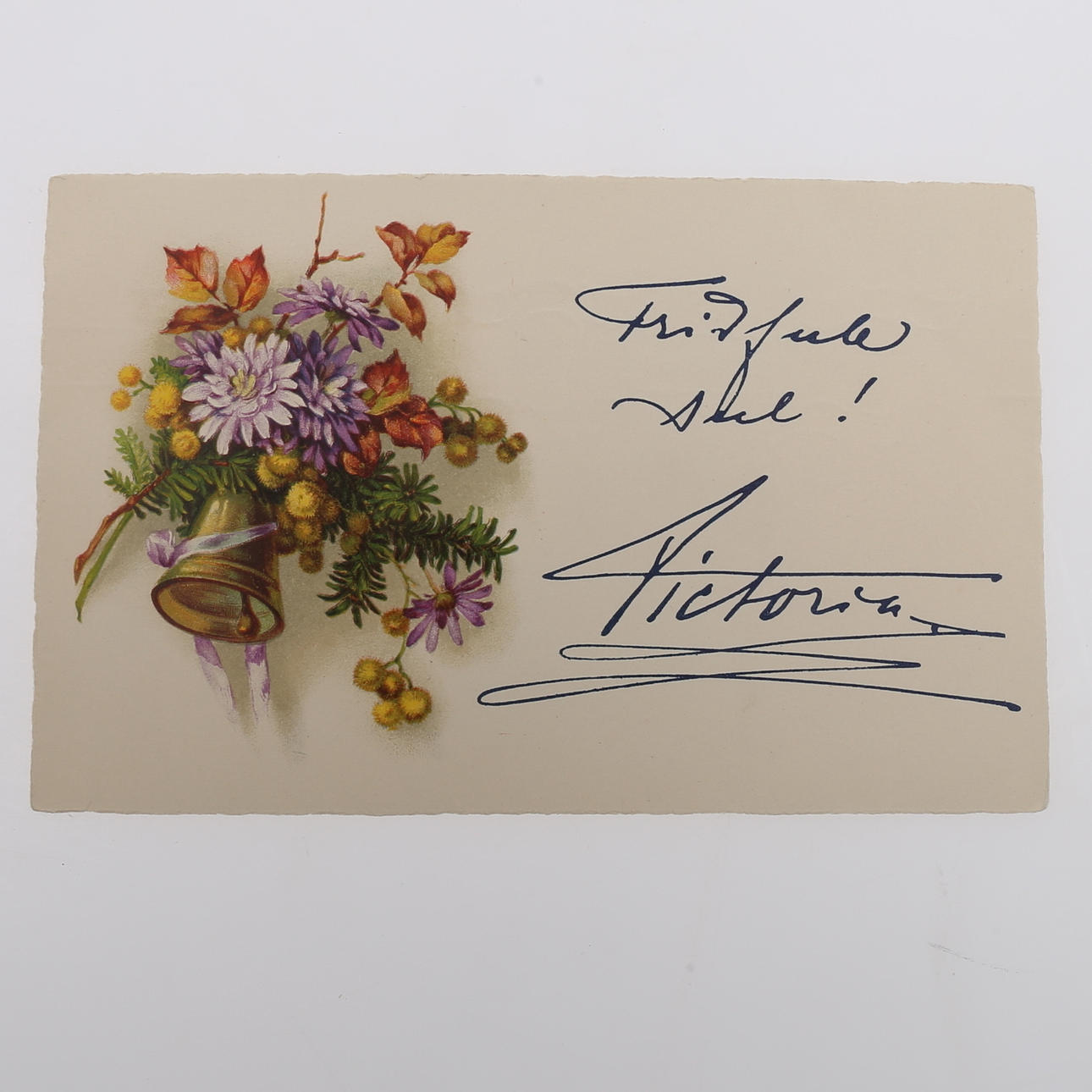 Litet parti svenska autografer. 1. Bevittnad äldre handling daterad 14 sept. 1839 (?) där författaren och biskopen Esaias Tegnér (1782-1846) och Elof Tegnér d. ä. har bevittnat riktigheten i bl. a. sin blivande svågers namnteckning. 2. Författaren Alice Lyttkens (1897-1991). Autograf med blå bläckpenna på litet vitt papper. 3. Författaren Verner von Heidenstam (1859-1940.) Autograf med svart bläck på litet vitt papper. Fick Nobelpriset i litteratur 1916. 4. Konstnären Carl Larsson (1853-1919). Autograf i brunsvart bläck på baksidan av Carl G. Laurins visitkort. 5. Forskningsresanden Sven Hedin (1865-1952). Handskrivet brev om 1 A 4-sida Sven Hedin skickar artiklar och foton m. m. till Hemmets Journals redaktör Nilsén och ber att få tillbaka materialet efter användadet. "Med utmärkt högaktning Eder förbundne Sven Hedin". 6. Drottning Viktoria (1862-1930). En julhälsning på ett trevligt illustrerat kort. Signatur i blått bläck.