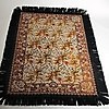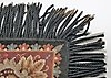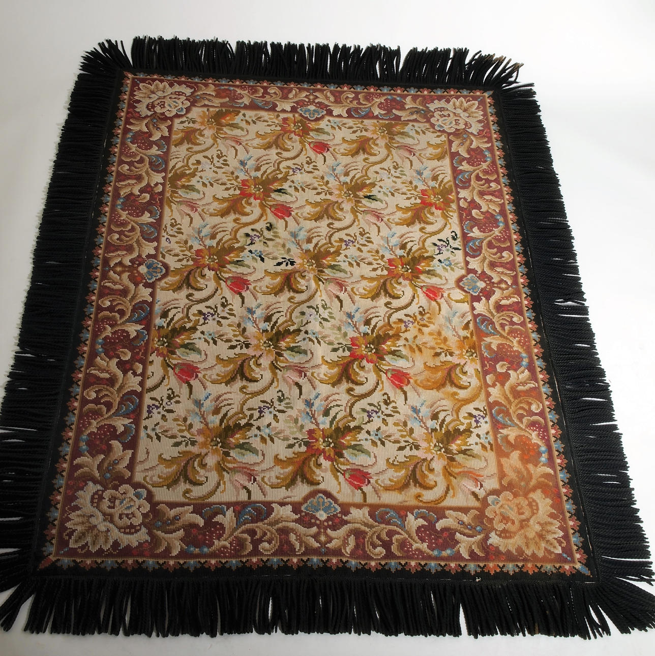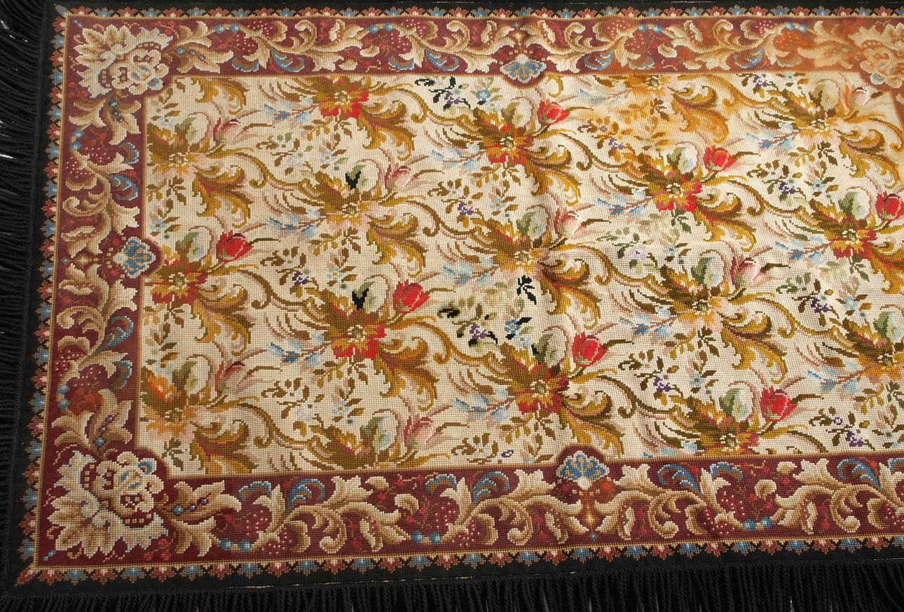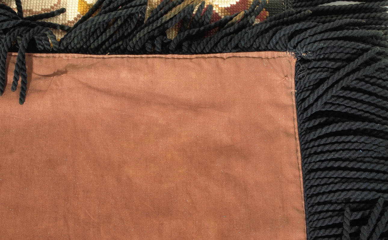 Korsstygn med franskant, fodrad baksida Mått utan frans, 193 x 126 cm.
