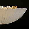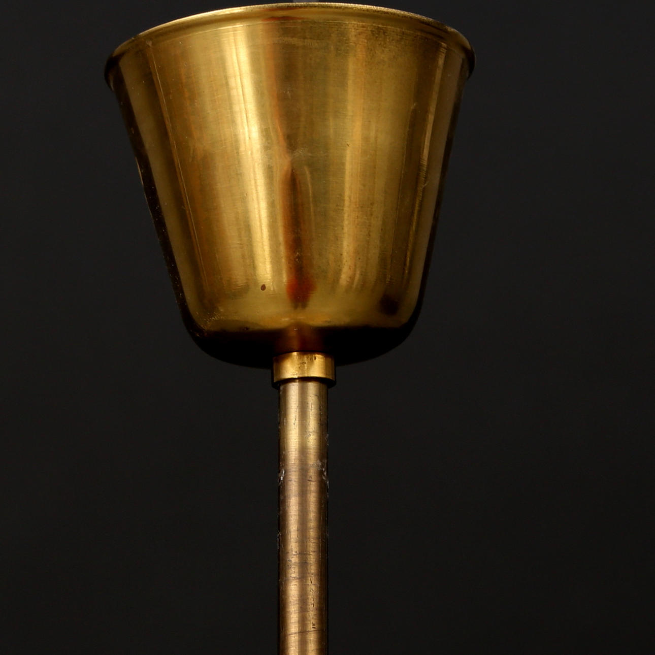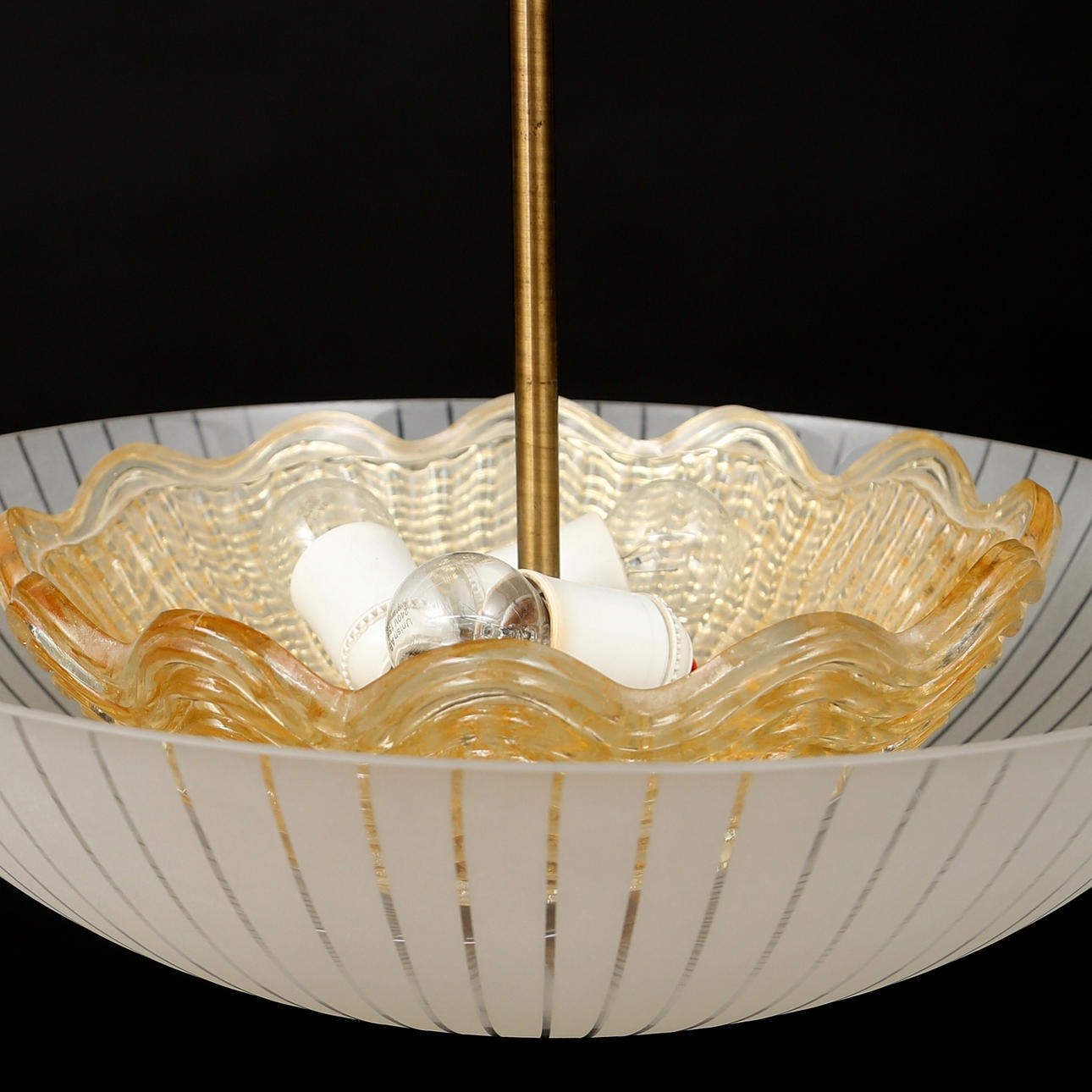 Ytterkupa av etsat glas med randdekor, innerkupa av blåst kristall. Monterad med mässing. För tre ljuspunkter.