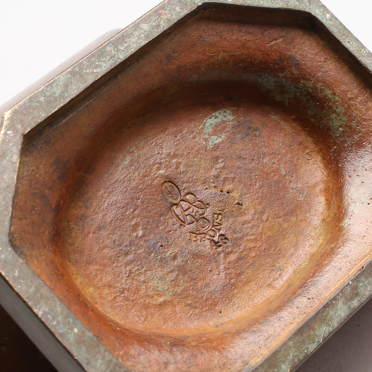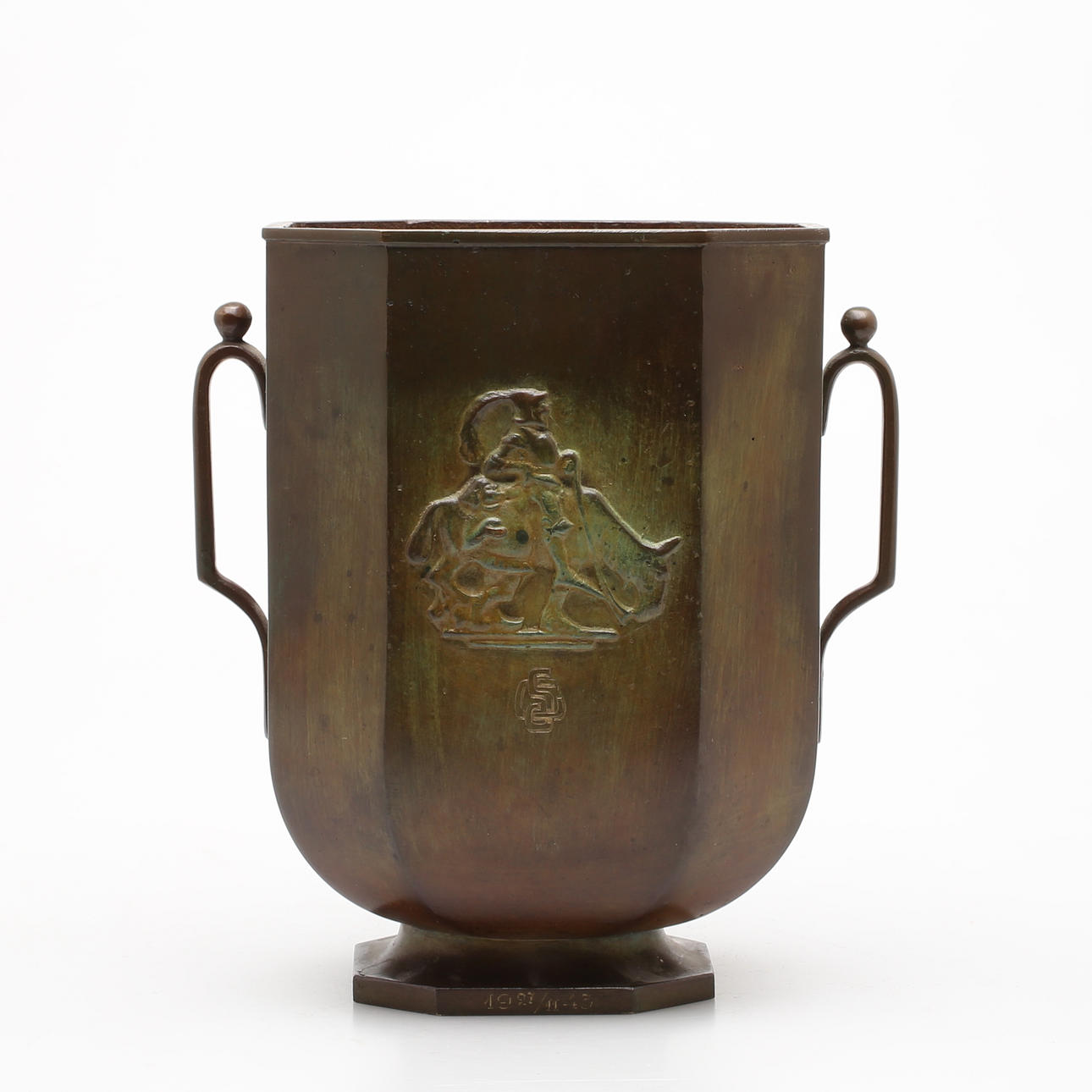 8-kantig, figurer i relief, gravyrer. Stämplad GAB, brons 48. Höjd 22 cm.