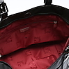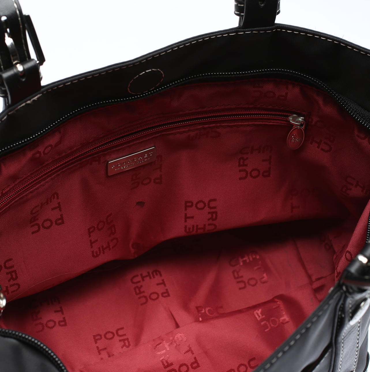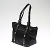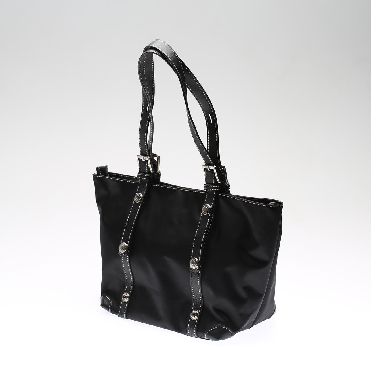 Textil samt skinn. Fack med dragkedja samt två invändiga fack varav ett med dragkedja. Två justerbara handtag. Ca 33 x 21 cm.