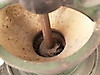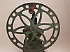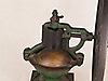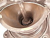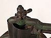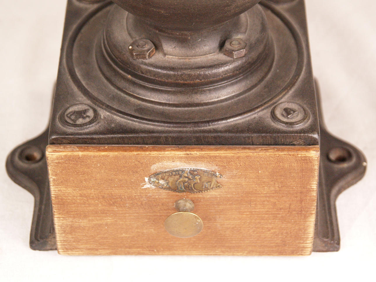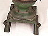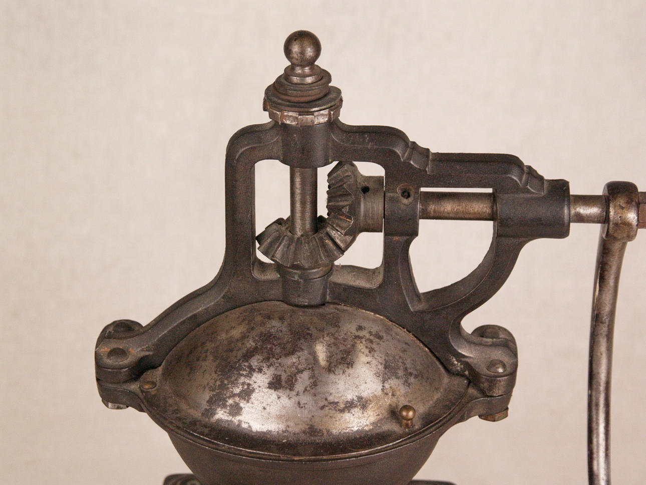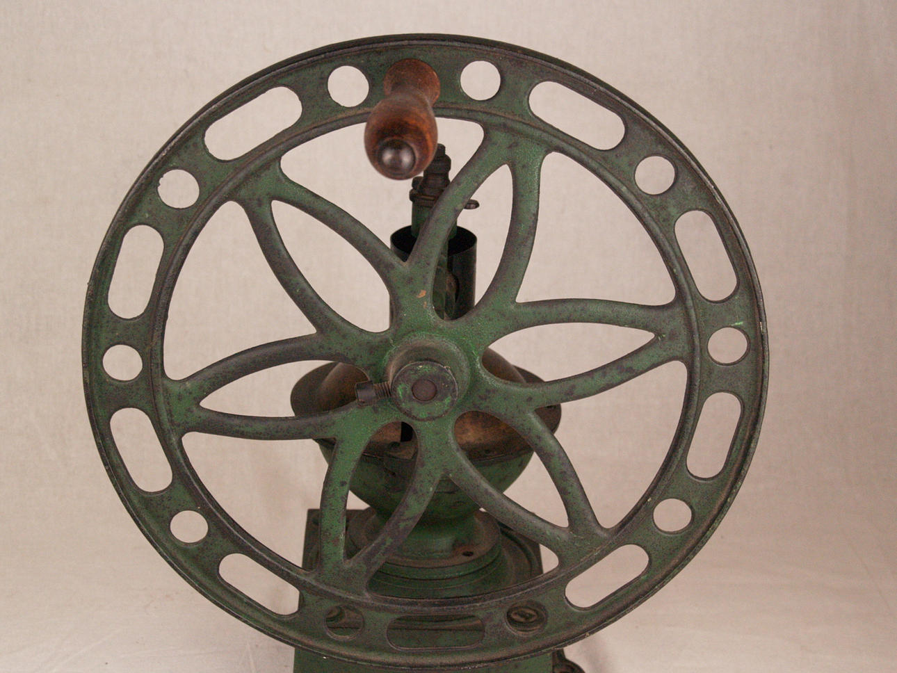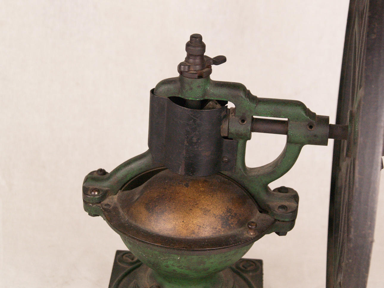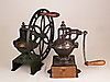 Två stora kaffe/kornbruk - 1800/1900-tal, järn/trä, 1x med stort hjul för svarvning, H: ca. 43 respektive 36 cm.