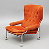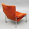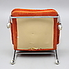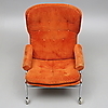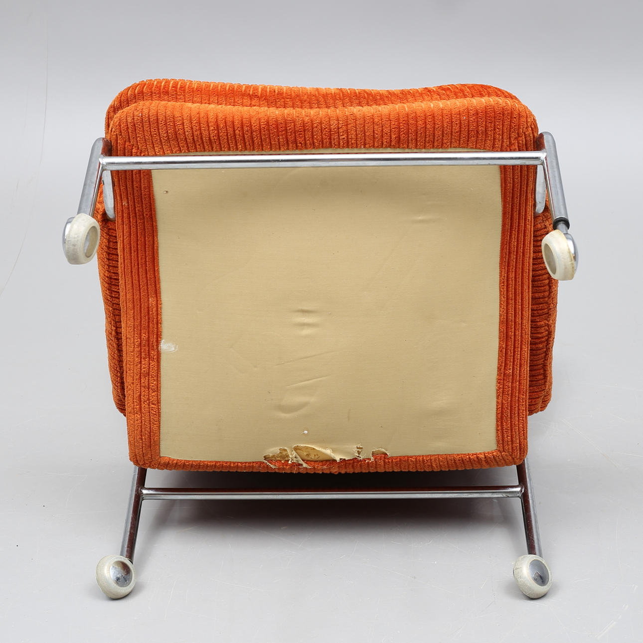 Skada undertill, skada längst ut på ett armstöd, möjligen lagad söm upptill på ryggen.